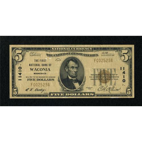 <B>Waconia, MN</B></I> - $5 1929 Ty. 1 <B>The First NB</B></I> Ch. # 11410<BR> Only the five dollar denomination was issued by this Carver County bank after it opened in 1919. Fairly scarce, there are only twenty small size in the census including this <B>Very Fine</B></I> example which has heavily discolored paper.<BR><BR><b>Shipping:</b> Coins & Currency (<a target="_blank" href="http://www.heritageauctions.com/common/shipping.php">view shipping information</a>)