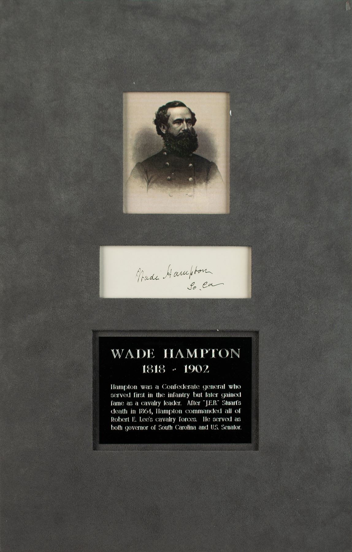 Bold ink signature, "Wade Hampton, So. Ca.,” on an off-white 5 x 1.75 slip, suede-matted with a portrait and plaque to an overall size of 11.5 x18. In fine condition, with a ding to top edge of the mat.