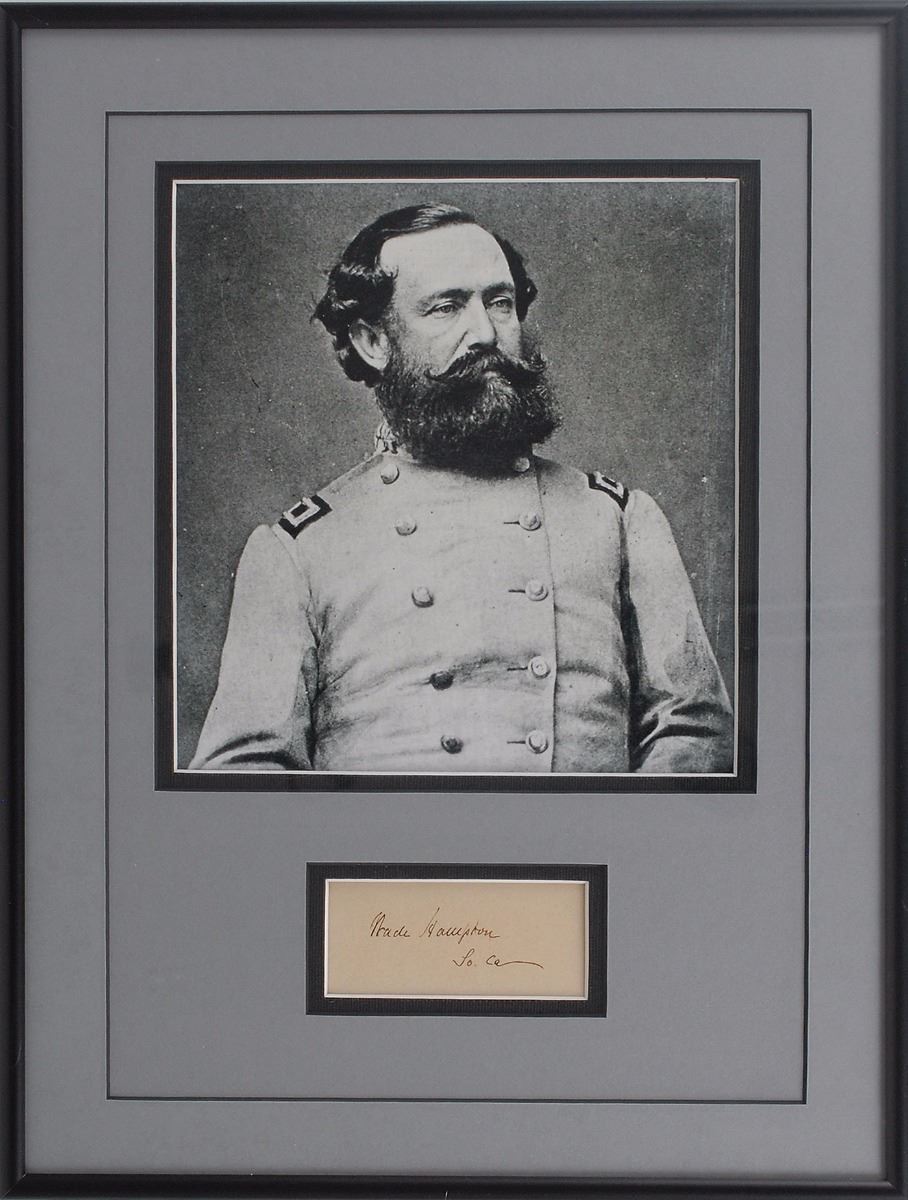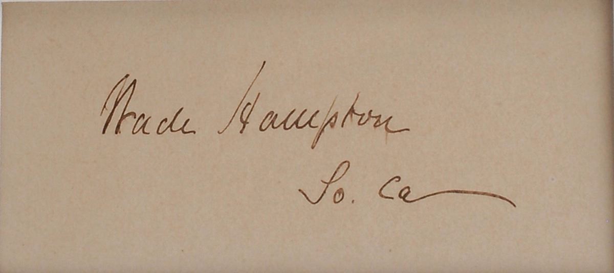 Ink signature, “Wade Hampton, So. Ca,” on an off-white 3.5 x 1.5 card. Triple-matted and framed with a portrait of Hampton to an overall size of 12.25 x 16.25. In fine condition.