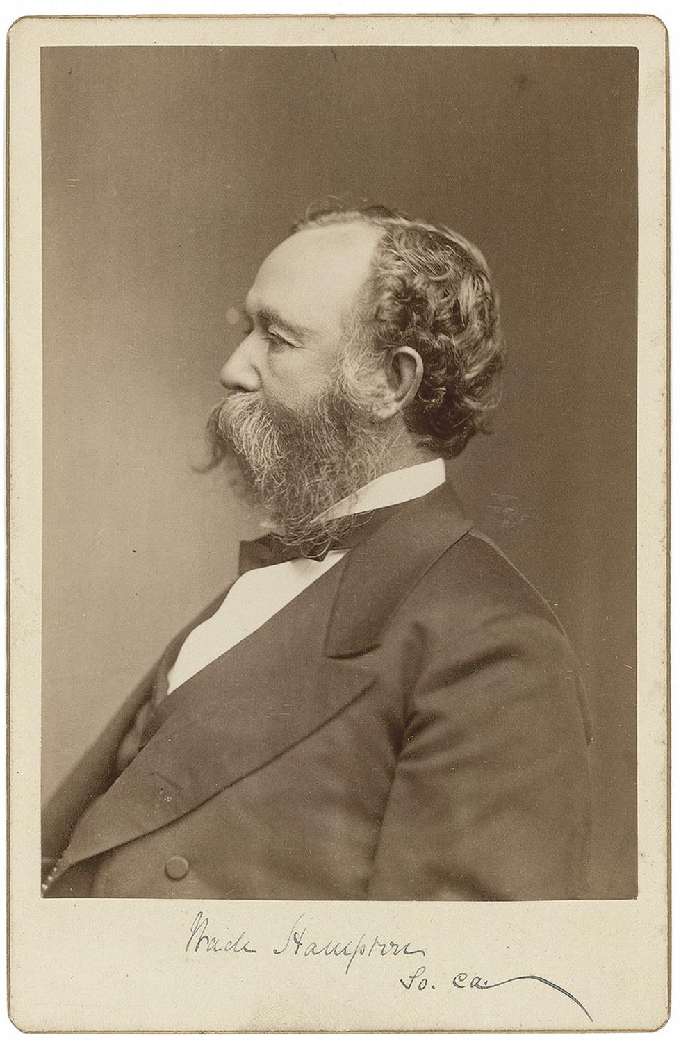 Confederate military officer and politician (1818–1902) who replaced J. E. B. Stuart as Lee’s Chief of Cavalry following Stuart’s death on the battlefield. Hampton later served as governor and senator from South Carolina. Scarce original 4.25 x 6.5 cabinet photo of Hampton in profile, signed in the lower border in black ink, “Wade Hampton So, Ca.” In fine condition, with just a few scattered light surface marks. An exceptionally handsome and crystal-clear example.