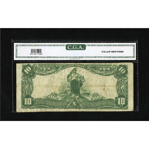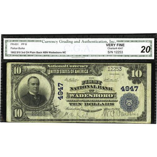 <B>Wadesboro, NC</B></I> - $10 1902 Plain Back Fr. 631 <B>The First NB </B></I> Ch. # 4947<BR>This lightly circulated large size note retains strong stamped signatures and is one of the nicer notes available from here. Graded <B>Very Fine 20</B></I> by CGA.