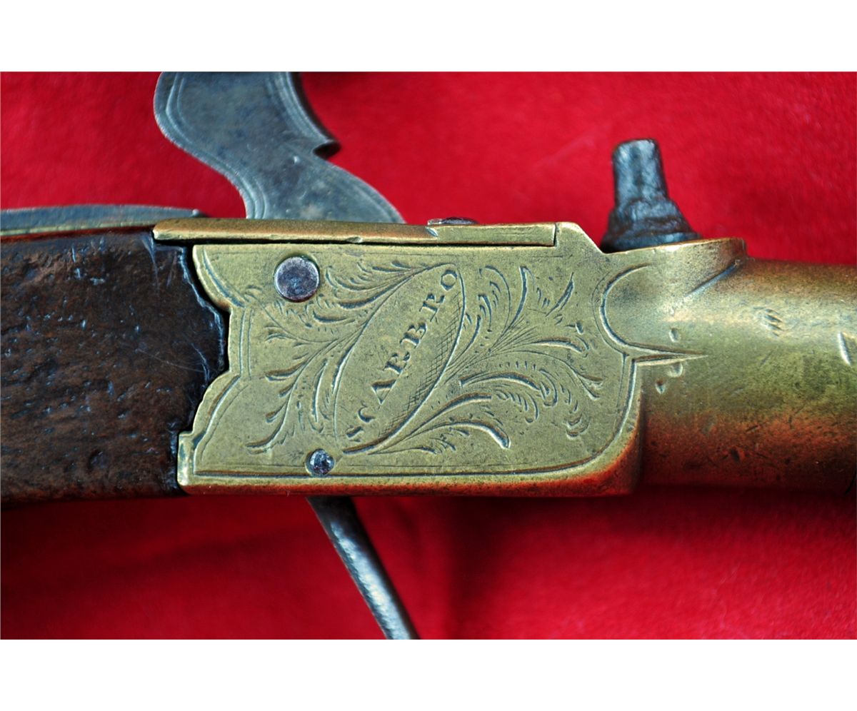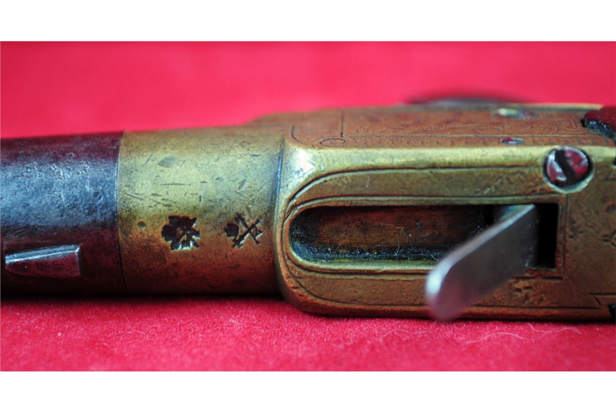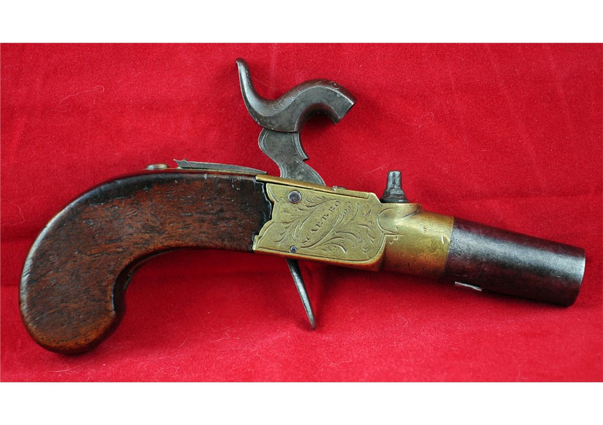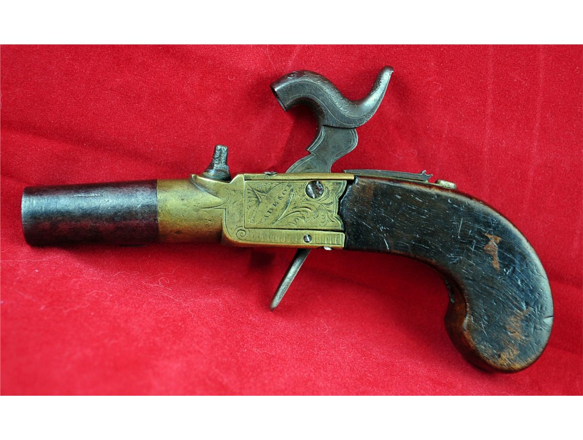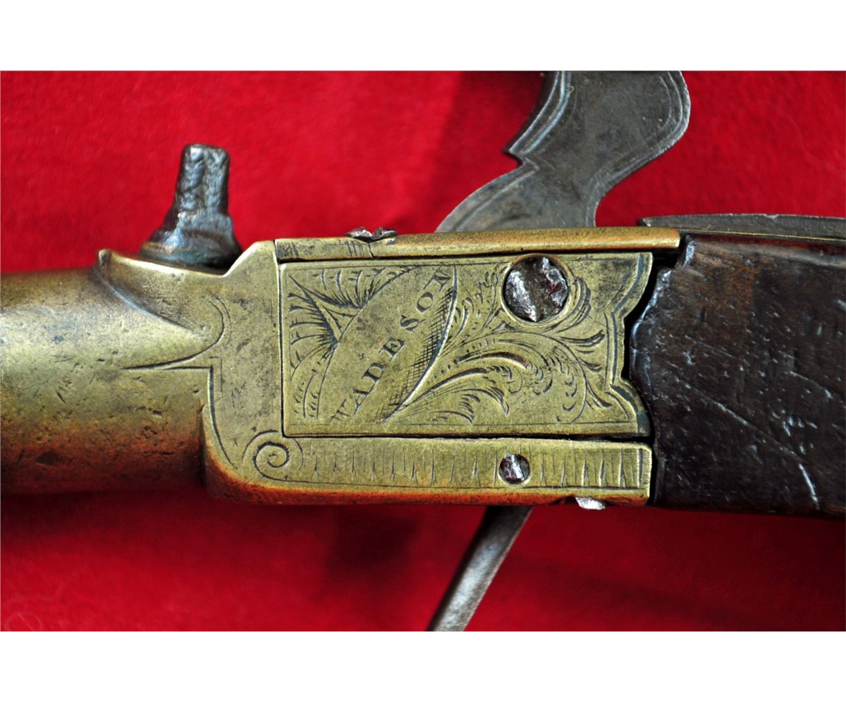 Wadson Percussion Boxlock Pistol, 45 Cal., 2' inch barrel. Fancy engraved brass frame and steel barrel. Floding trigger. Marked Wadeson and Scarbro. See photos for more information. Kennedys Auction Service has not attempted to test fire any gun in this auction and all guns are sold in "AS IS CONDITION" and are not guaranteed to be operational.