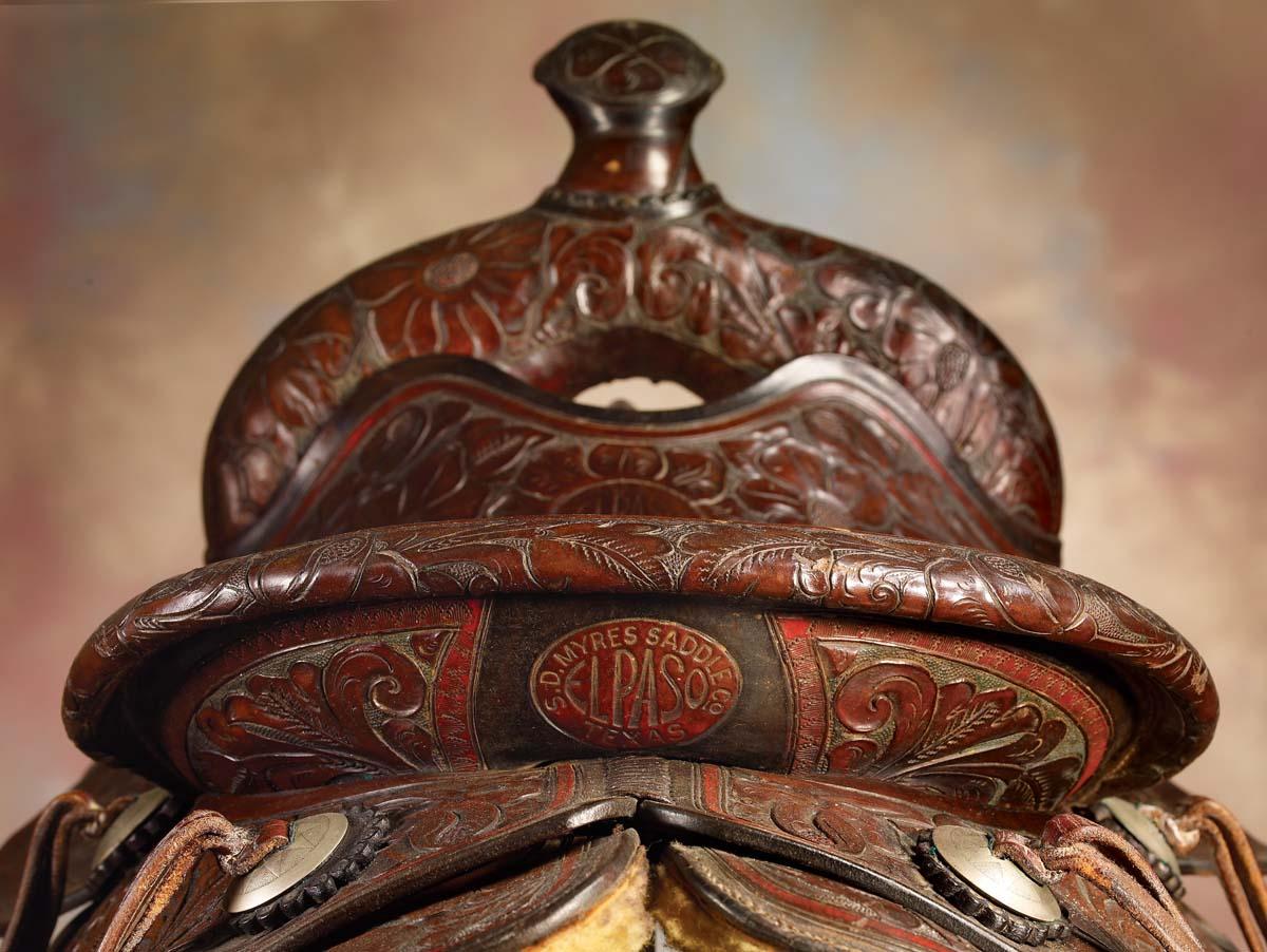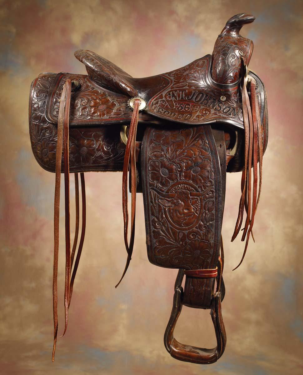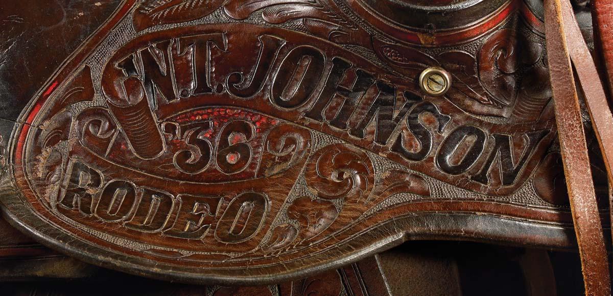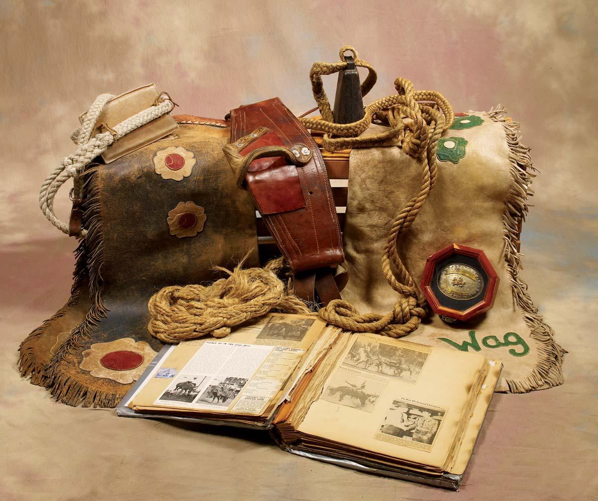 Includes 1936 S D Myres Saddle, maker-marked on the 14 1/2" seat and rear cantle, from the W T Johnson Rodeo with longhorn carved on fender, bronc riding cinch, 2 pair fancy fringed shotgun chaps, rope with cowbell. Old photo album with pictures and newspaper clippings and a Trophy Buckle Rodeo Cowboys Association World Champion Bull-Rider Wag Blessing