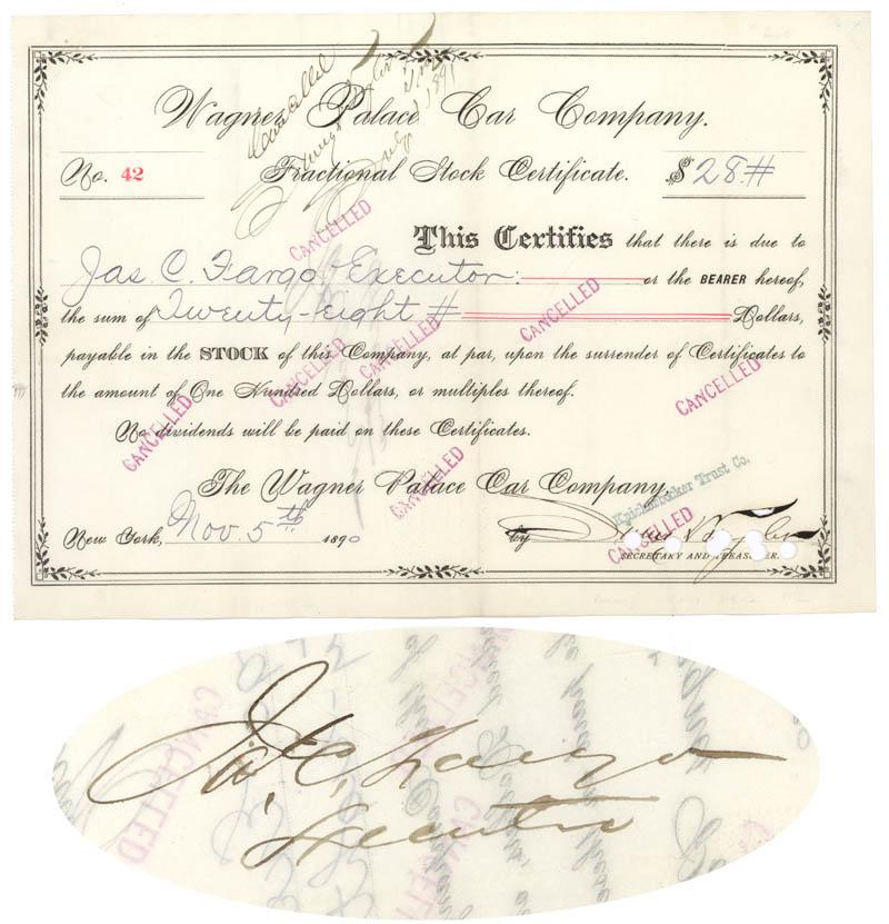 1890, New York. Stock certificate Issued to “Jas C. Fargo, Executor,” and signed on verso by JAMES C. FARGO (1829 - 1915). Expressman. Working along with his older brother, William, co-founder of the American Express Co., James became a prominent figure in the railroad and express industries. He became president of American Express in 1881 upon his brother's retirement from that position. The Wagner Palace Car Company came into existence as a result of a reorganization of the New York Central Sleeping Car Company in 1865 which had manufactured Webster Wagnerís widely popular sleeping cars exclusively for the New York Central Railroad. The company manufactured both sleeping cars and drawing-room cars, later incorporating some of the Pullman companies innovations by contract with the company. Punch, stamp and pen cancelled. Very fine