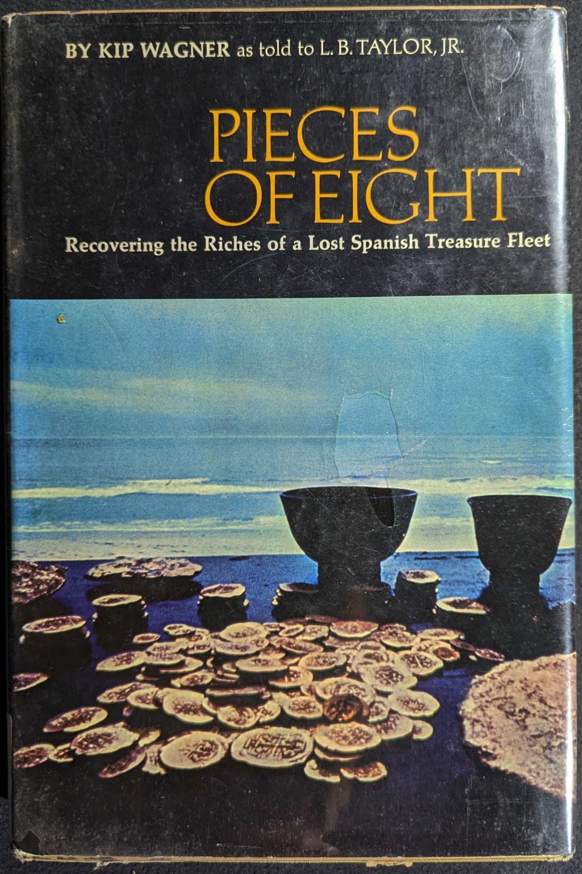 Wagner, Kip & L. B. Taylor Jr. PIECES OF EIGHT. RECOVERING THE RICHES OF A LOST SPANISH TREASURE FLEET. E.P. Dutton & Co., Inc. 1966. 8vo. (4), 221, (5) pages. New York. original tan cloth, lettered in blue; protected dust jacket. frontispiece. color and b&w illustrations. maps. mapped end papers. Very Good. withdrawn from Buffalo and Erie Public Library. This book is story of the finding and partial salvage of the '1715 Fleet' of 10 sunken Spanish galleons off Vero Beach, Florida in the 1960's. as told by the original salvor. Kip Wagner's story started the underwater treasure hunting craze in Florida. This is one of the most collectible of all sunken treasure books in the US. Lot weight: 1 lbs 6oz. Subject(s): Sunken Treasure.
