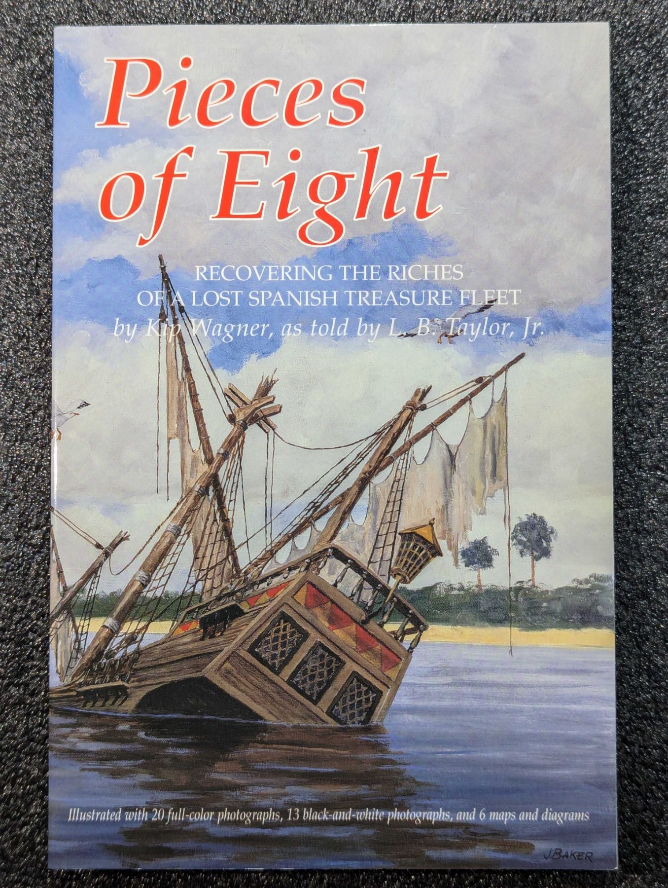 Wagner, Kip & L. B. Taylor, Jr. PIECES OF EIGHT - RECOVERING THE RICHES OF A LOST SPANISH TREASURE FLEET. Florida Classics Library, Port Salerno. 1998. 8vo. 221, (1) pages. original pictorial card covers. Reprint edition. Map. Appendix. B&w and color photos. English text. The David Baker Library. Fine. Twentieth-century sleuthing methods are linked with the romance and mystery of the past in this true story of a treasure hunt that has yielded millions. Over 250 years ago a Spanish treasure armada was wrecked on the Florida reefs, and ten richly laden vessels were sunk. In time they were forgotten. In the l 940's Kip Wagner, then a Florida construction man, picked up the first clues to the location of the wrecked ships. They were scarce: occasional blackened silver coins discovered here and there along the beach. But Kip Wagner's imagination was fired, and with the help of his friend and physician, Dr. Kelso, he began the long research and search operations that are described in this engrossing book. They were joined by a small group of other men and formed the Real Eight Corporationappropriately named for the Spanish ocho reales, or piece of eight. Most of the team had other jobs, some of them at nearby Cape Kennedy, and could hunt treasure only in their spare time. But they persisted. The work was arduous, at times dangerous. There were setbacks, disappointments, grueling underwater ordeals. But in time the rewards were sensational -thousands of silver pieces of eight and golden doubloons, silver bars and bullion, gold ingots, gold rings and pendants, priceless Chinese porcelain, a gold necklace appraised by a museum at $50,000, three million dollars in treasure recovered so far by this band of hard-working, adventurous, persistent men. Lot weight: 0 lbs 13oz. Subject(s): Sunken Treasure.