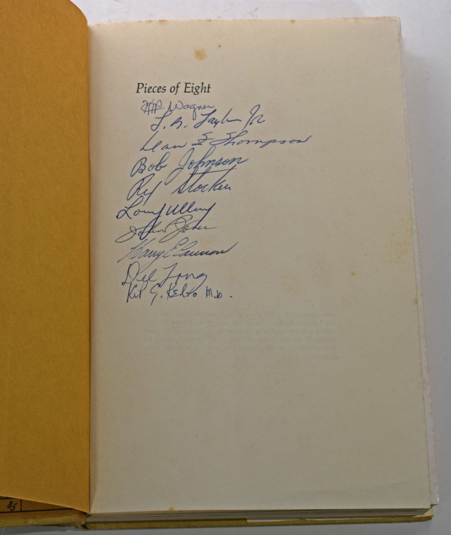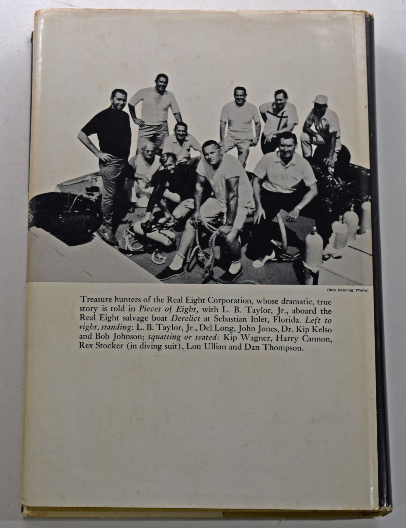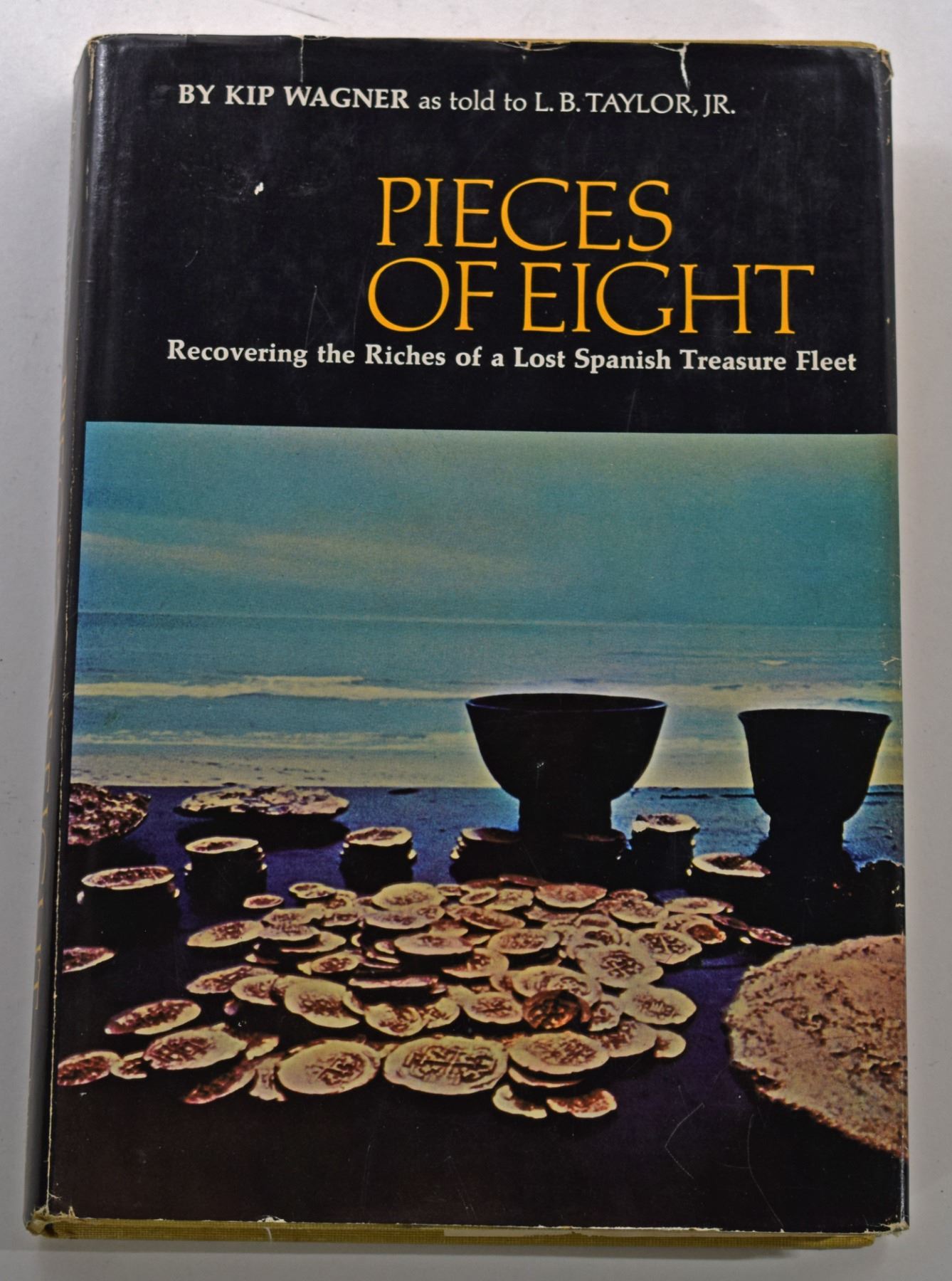 Wagner, Kip & L.B. Taylor, Jr. (Signed) PIECES OF EIGHT: RECOVERING THE RICHES OF A LOST SPANISH TREASURE FLEET. E.P. Dutton & Co., Inc. 1966. 8vo, 221 pages; Hardcover w/ DJ; Signed by the authors and the members of the Real Eight Company; This book is story of the finding and partial salvage of the 1715 Fleet of 10 sunken Spanish galleons off Vero Beach, Florida in the 1960's.told by the original salvor. Kip Wagner's story started the underwater treasure hunting craze in Florida. This is one of the most collectible of all sunken treasure books in the US. Subject: History - Sunken Treasure