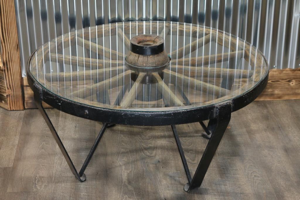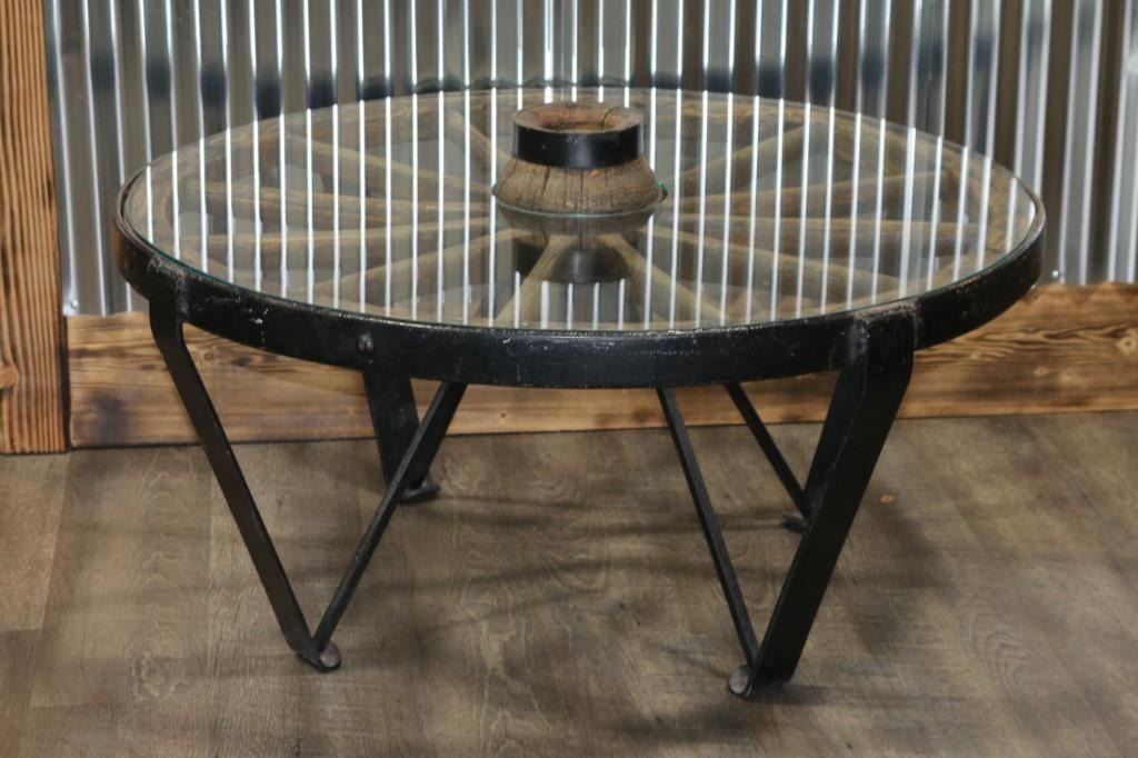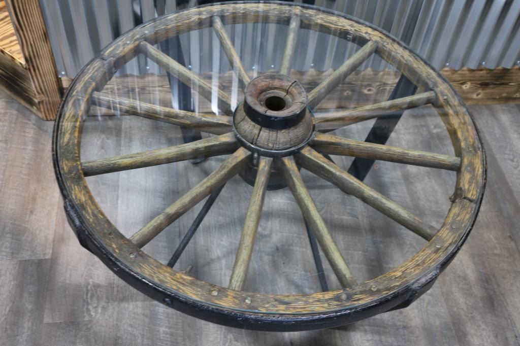 Measures 18 1/2" tall and 39 1/2" circumference. Metal frame with vintage wagon wheel topped with heavy glass. CANNOT BE SHIPPED, LOCAL PICK UP ONLY.