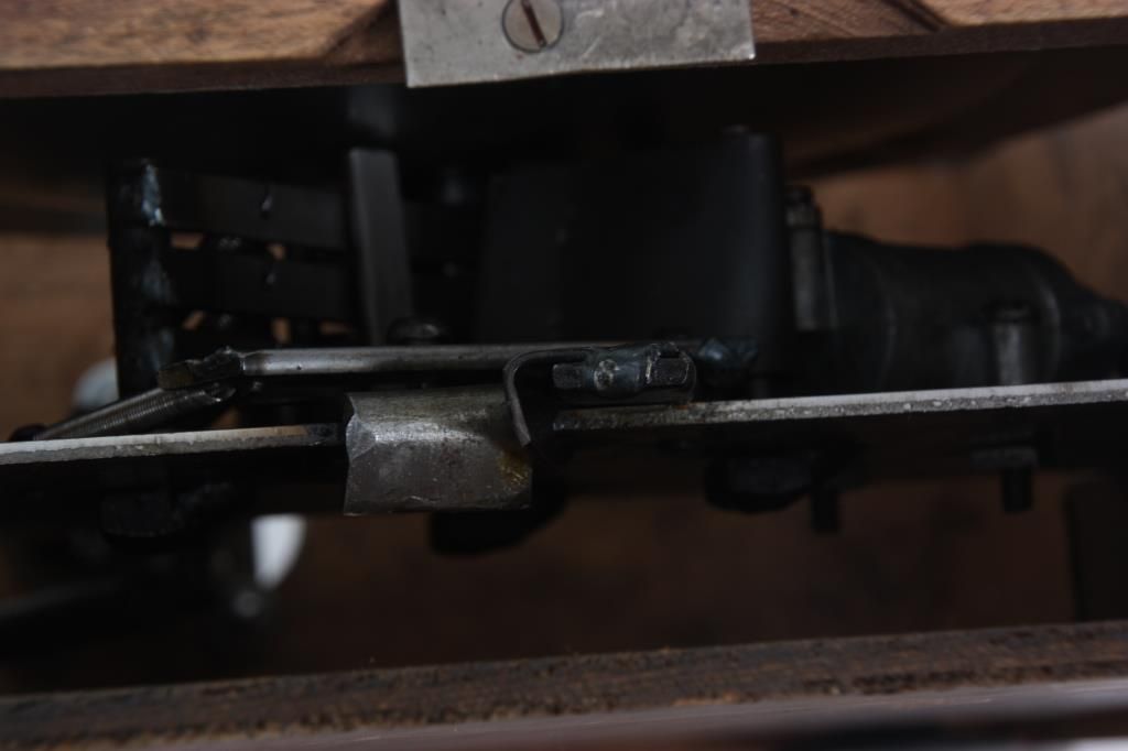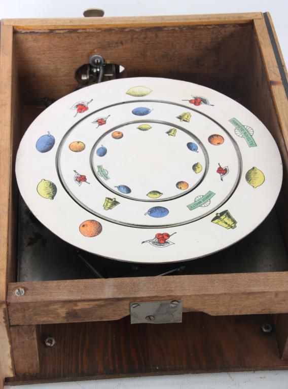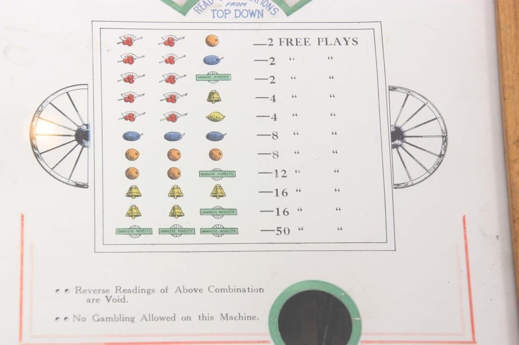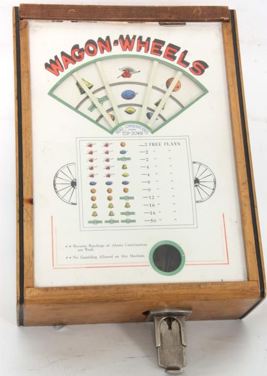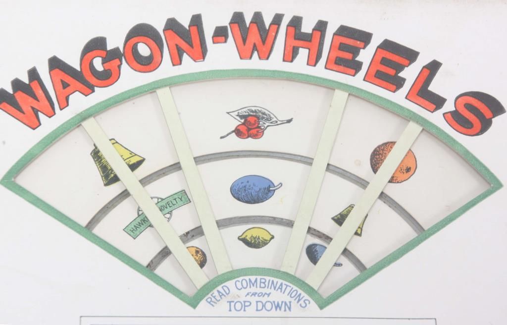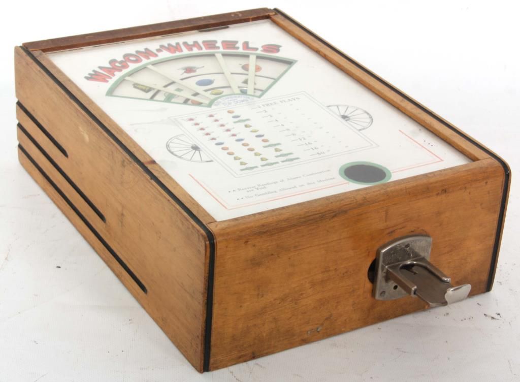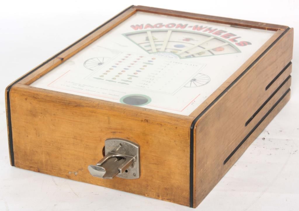 Wagon Wheels 10 Cent Trade Stimulator Game. Maple case with black stripes on the sides, litho cardboard game board under the glass top, reads “Wagon-Wheels” for amusement only. Has a selector lever in the front to select the anticipated winning horse next to the nickel coin slot and gum ball dispenser. Has keys and is in working condition. When the coin is dispensed the 3 discs spin. By ABT Mfg. Co. Chicago, Ill, circa 1930’s. Measures 5 in. high x 10 in. wide x 17.75 in. long.