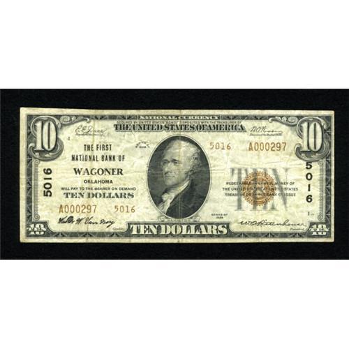 <B>Wagoner, OK</B></I> - $10 1929 Ty. 2 <B>The First NB</B></I> Ch. # 5016<BR> This issue still boasts a lot of life for a mid-grade piece. <B>Fine-Very Fine </B></I>with a couple of pinholes.<BR><I>From The Rolling Plains Collection</B></I><BR><BR><b>Shipping:</b> Coins & Currency (<a target="_blank" href="http://www.heritageauctions.com/common/shipping.php">view shipping information</a>)