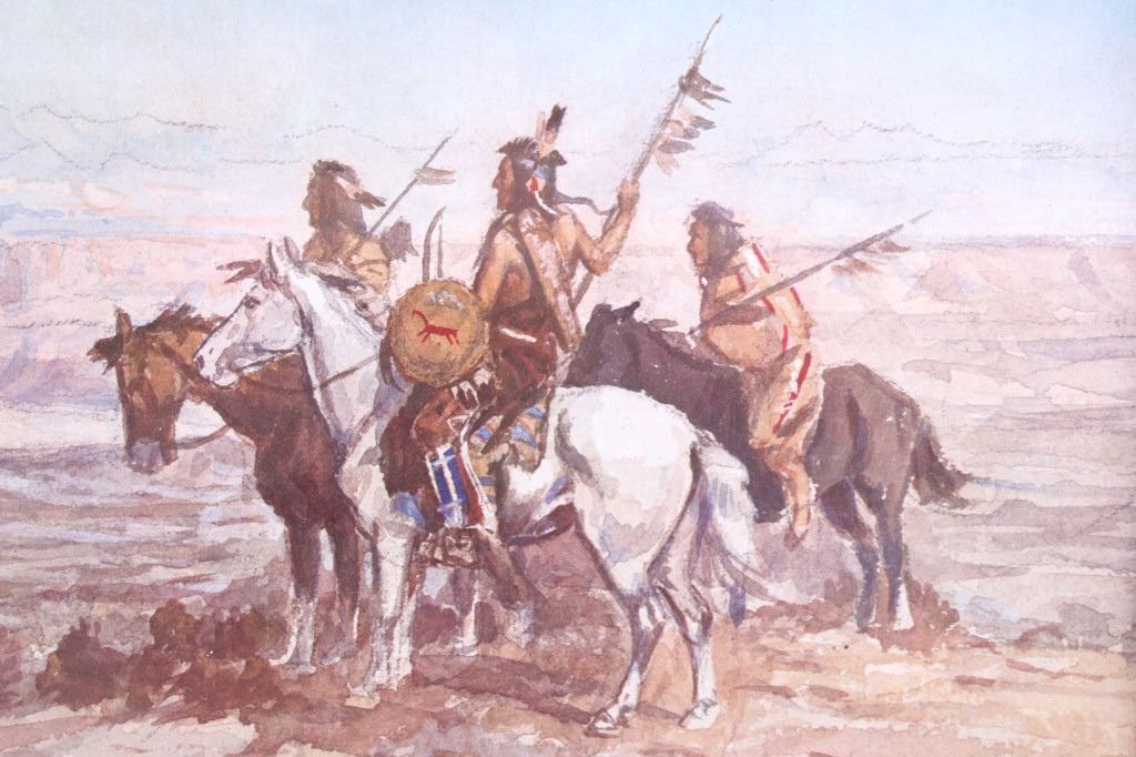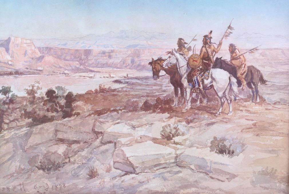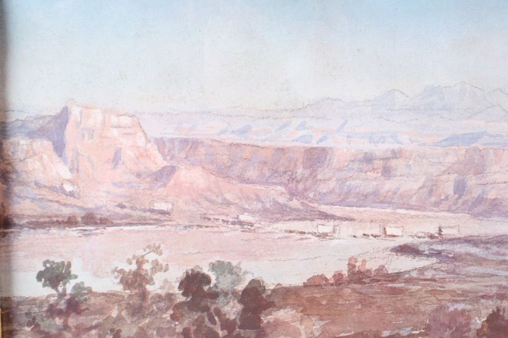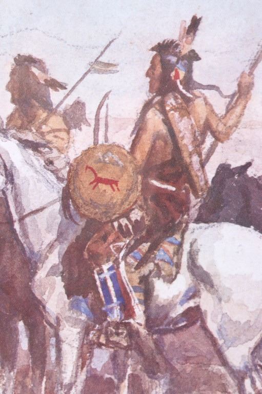 For your consideration is this Charles Russell driftwood framed print, "Wagons Westward". Russell painted the original in 1898. The painting shows three Indians on horseback, watching from a bluff as a wagon train passes westward down below. The print and frame are in good condition. The print measures about 18" x 25"; framed: 24" x 31.5".
