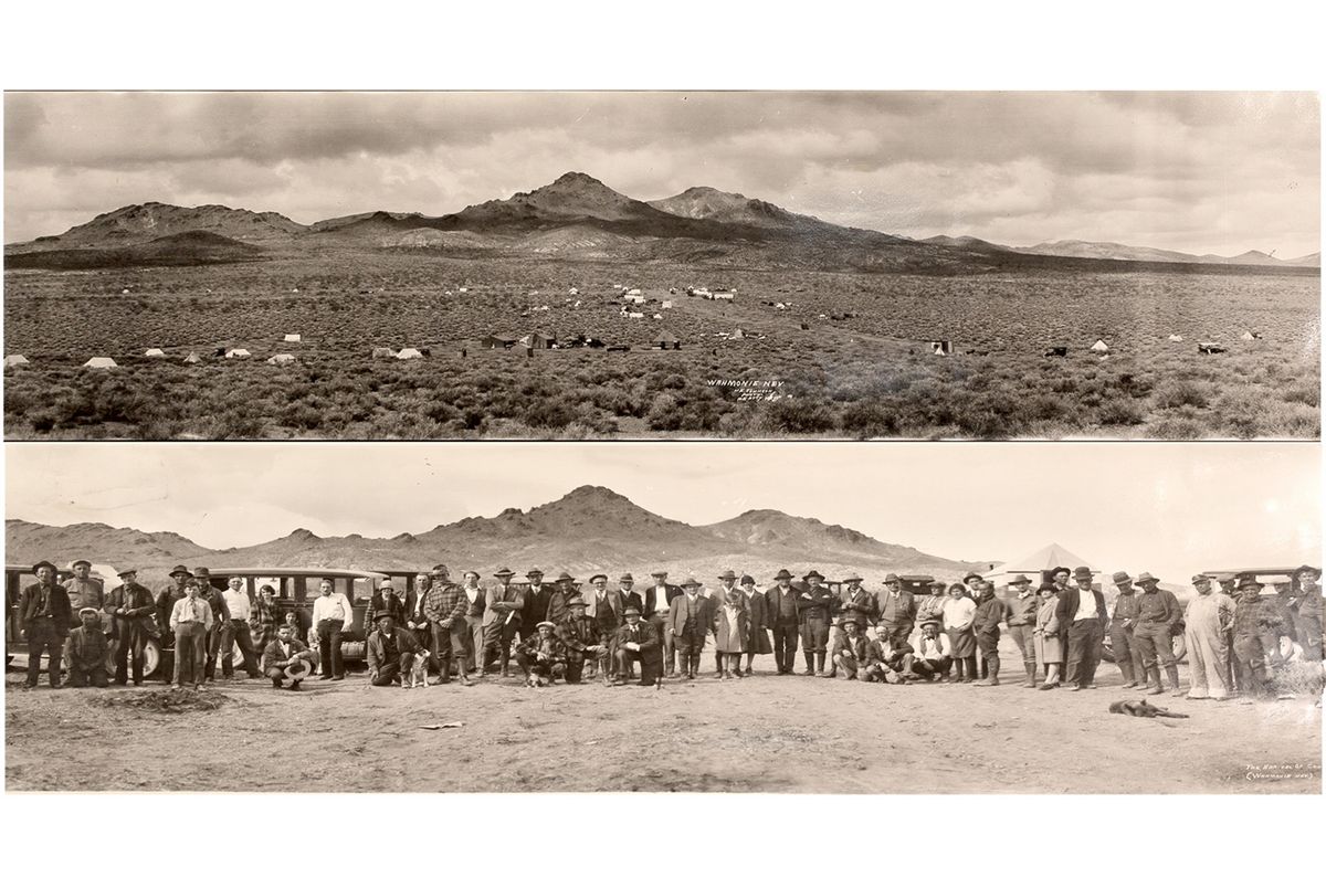 c1920 Lot of 2. 1) Panorama of the mining camp from up the hill. Tents and a few early automobiles dot the sagebrush in the otherwise empty valley 30 miles east of Beatty. 2) A panorama of the miners (some pictured with family) hired by George Wingfield to work the Shoshone Mountain mining camp. The camp was organized in 1928 "when two prospectors Mcrae and Lefler rediscovered silver in the old Hornsilver Mine" [Ref: Carlson, Nevada Place Names, 1974, p. 240]. The camp was south of the mine (which is not pictured in either of the panoramas). The Hornsilver was so named because of the rich hornsilver ore found here [Ref: Carlson, Nevada Place Names, 1974, p. 136]. Each 30.5" x 8" and are currently rolled. Photographer was N.E. (Ned) Johnson from Beatty, NV. Johnson was known to have doucmented the mining booms in a number of Nevada and California towns and camps including Bodie, Bullfrog, Rhyolite, and Rawhide. He was active between 1902 and 1931. New prints of Johnson`s photographs have been made available. These two panoramas are original prints from the 1920s. - HKA#66325