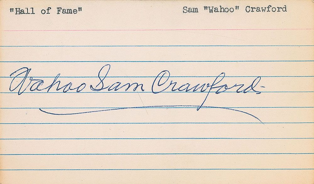 Ballpoint signature, “Wahoo Sam Crawford,” on an off-white 5 x 3 lightly-lined card . In fine condition, with some light toning working in from edges.