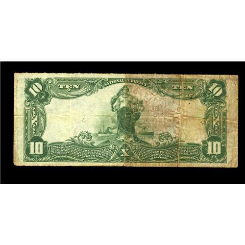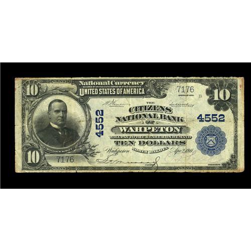 <B>Wahpeton, ND</B></I> - $10 1902 Plain Back Fr. 627 <B>The Citizens NB </B></I> Ch. # 4552<BR>The example we offer here is an otherwise Very Fine we'll classify as <B>Fine-Very Fine</B></I> due to wallet soiling on the back. The published census from here stands at 10 large size notes. This one should be worth in the range of...