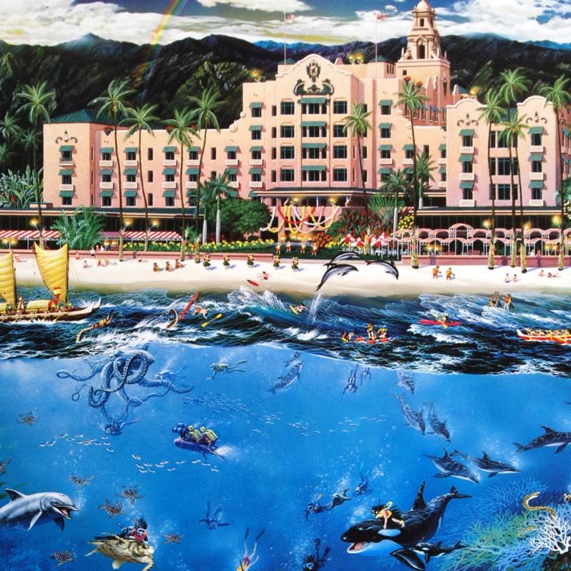 Alexander Chen creates stunningly detailed masterpieces filled with elaborate icons and a touch of fantasy. "Waikiki Beach" is a limited edition offset lithograph on paper by Alexander Chen, numbered and hand signed by the artist. Includes Certificate of Authenticity! Measures approx. 17.5" x 23.5" (with border), 15" x 21" (image).