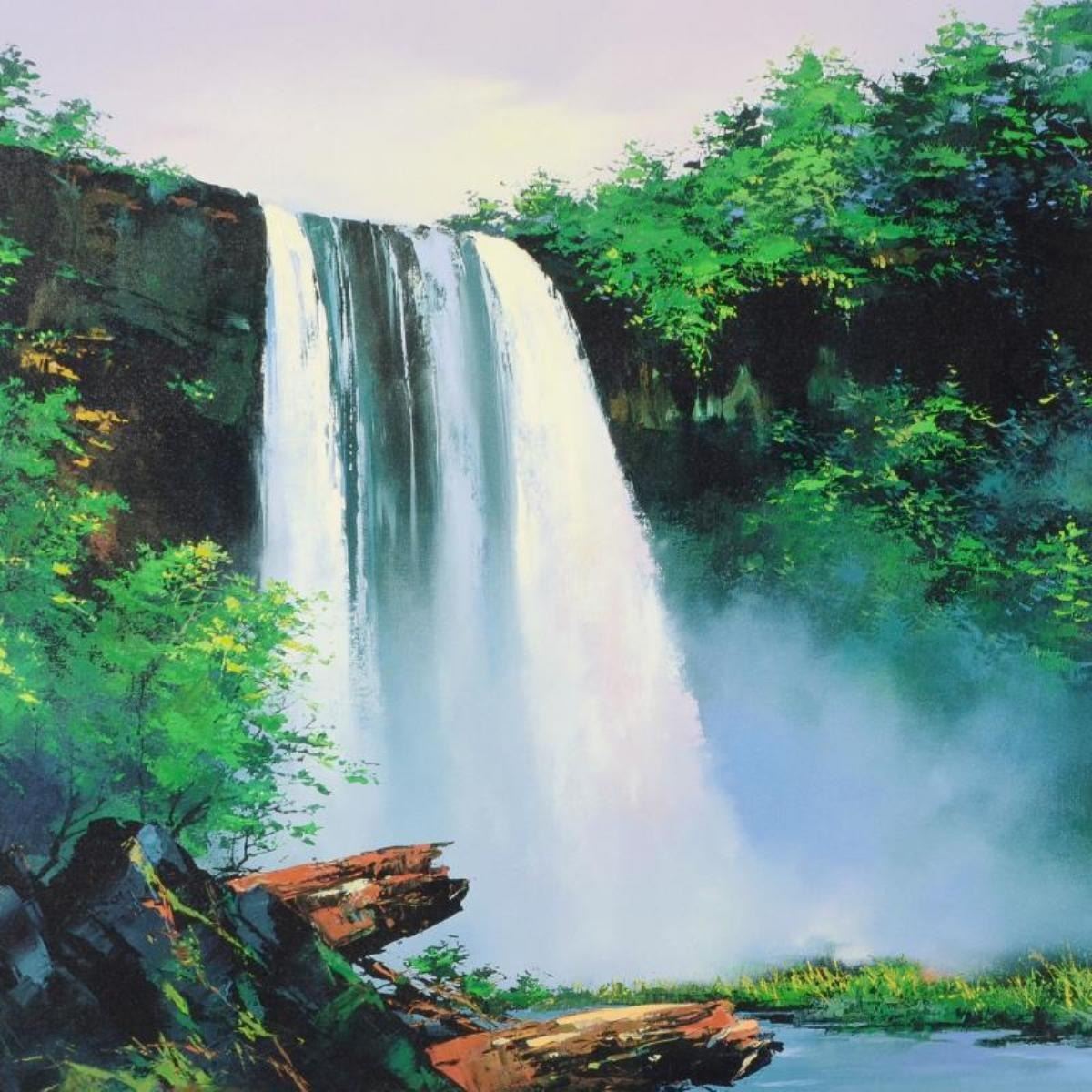 "Wailua Falls" is a hand embellished limited edition giclee on stretched canvas by Thomas Leung, numbered and hand signed by the artist. Includes Letter of Authenticity. Measures approx. 45" x 27" (image).