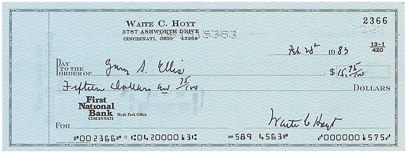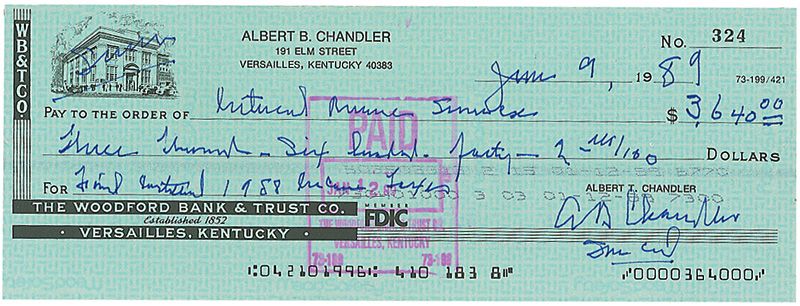 Two checks: one personal check, 8 x 3, February 28, 1983, filled out and signed by Hoyt, “Waite C. Hoyt;” and one personal check, 8 x 3, June 9, 1989, filled out and signed by Chandler, “A. B. Chandler.” In fine condition, with expected bank stamps and notations, and a central vertical fold to the Hoyt check.