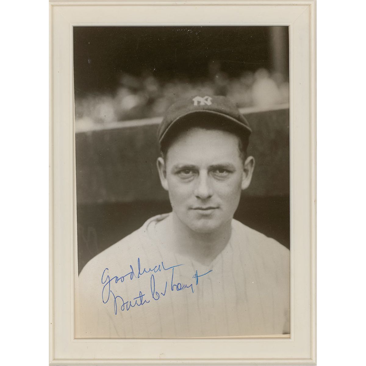 Two items: vintage glossy 5 x 7 photo of Hoyt in front of the dugout, signed in blue ballpoint, “Good luck, Waite Hoyt”; and a news clipping entitled, ‘This Day in Sports, Oct. 13, 1921,’ signed twice in ballpoint. In fine condition, with a few surface creases and impressions to the photo and irregularly trimmed edges to the clipping.