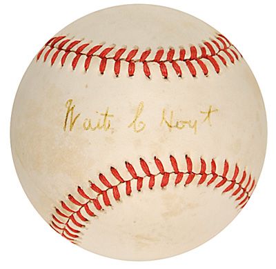 Official Rawlings American League baseball signed in black ballpoint on the sweet spot, “Waite C. Hoyt.” Some haloing to signature and scattered toning to ball, otherwise very good condition.