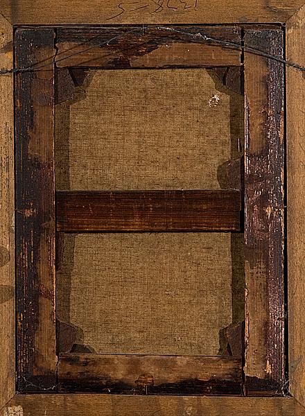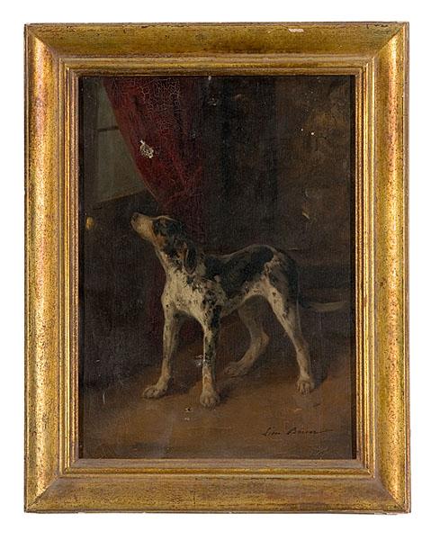 English, 19th century, oil on canvas, signed lower right Leon Brun, depicting a hound waiting at the door. Framed; 10" high x 13.25" wide (sight).