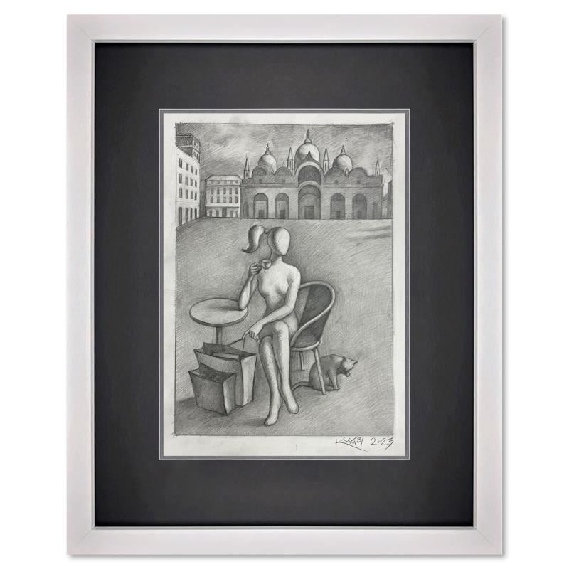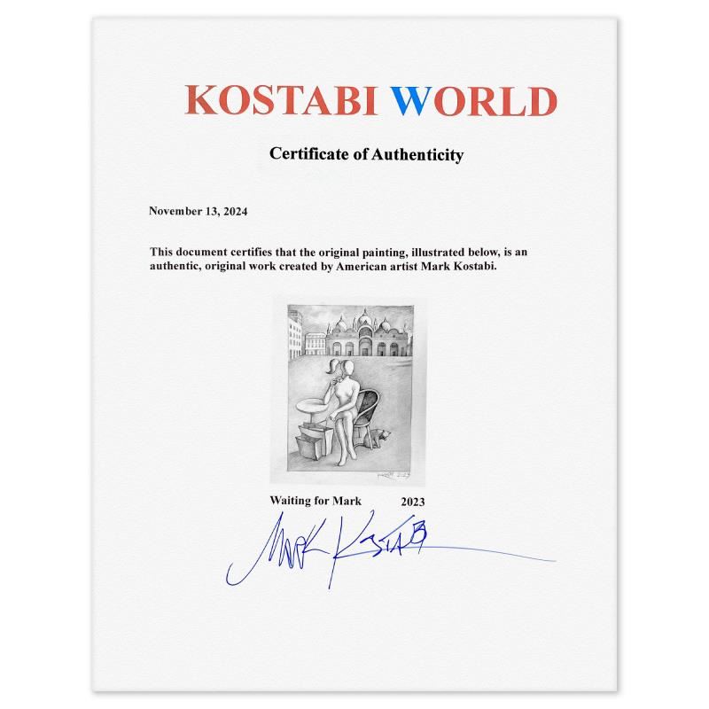 "Waiting for Mark - New York" is an original drawing on paper by Mark Kostabi, hand signed by the artist. This piece comes custom framed. Includes Certificate of Authenticity. Measures approx. 19.5" x 15.5" (frame), 13.5" x 9.5" (image). This item requires special handling and may have a longer than usual turnaround.