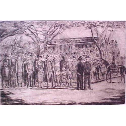 Waiting for a Parade on Constitution Ave, NW, DC by Chester Leich. Image 4 inches high x 6 inches wide.<p>Born in Evansville, Indiana - died 1978 Alexandria Va. He traveled widely in the Southwest, doing a number of paintings and drypoint and other etchings of Southwestern subjects.<p>He studied in Florence, Munich, and Berlin and with Siebelist in Hamburg, Germany.<p>He was a member of the Chicago and Brooklyn societies of etchers.