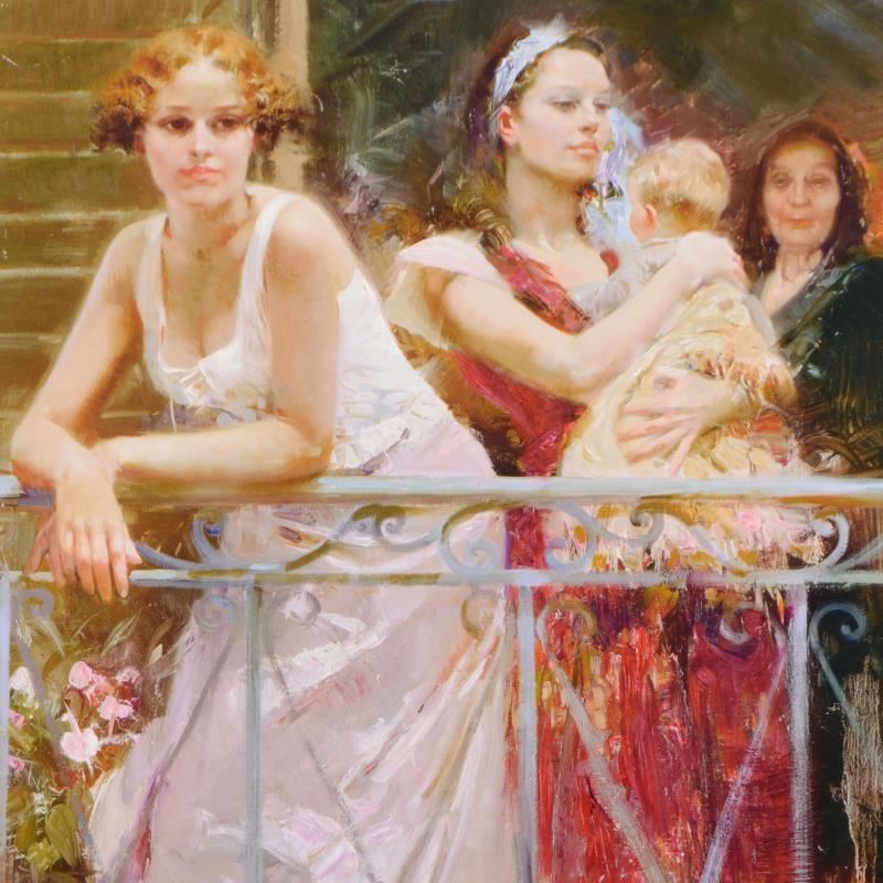"Waiting on the Balcony" is a limited edition giclee on stretched canvas that has been hand-embellished by Pino himself, AP Numbered and Hand signed by Pino (1939-2010). Includes Certificate of Authenticity. Measures approx. 48" x 36" (image).