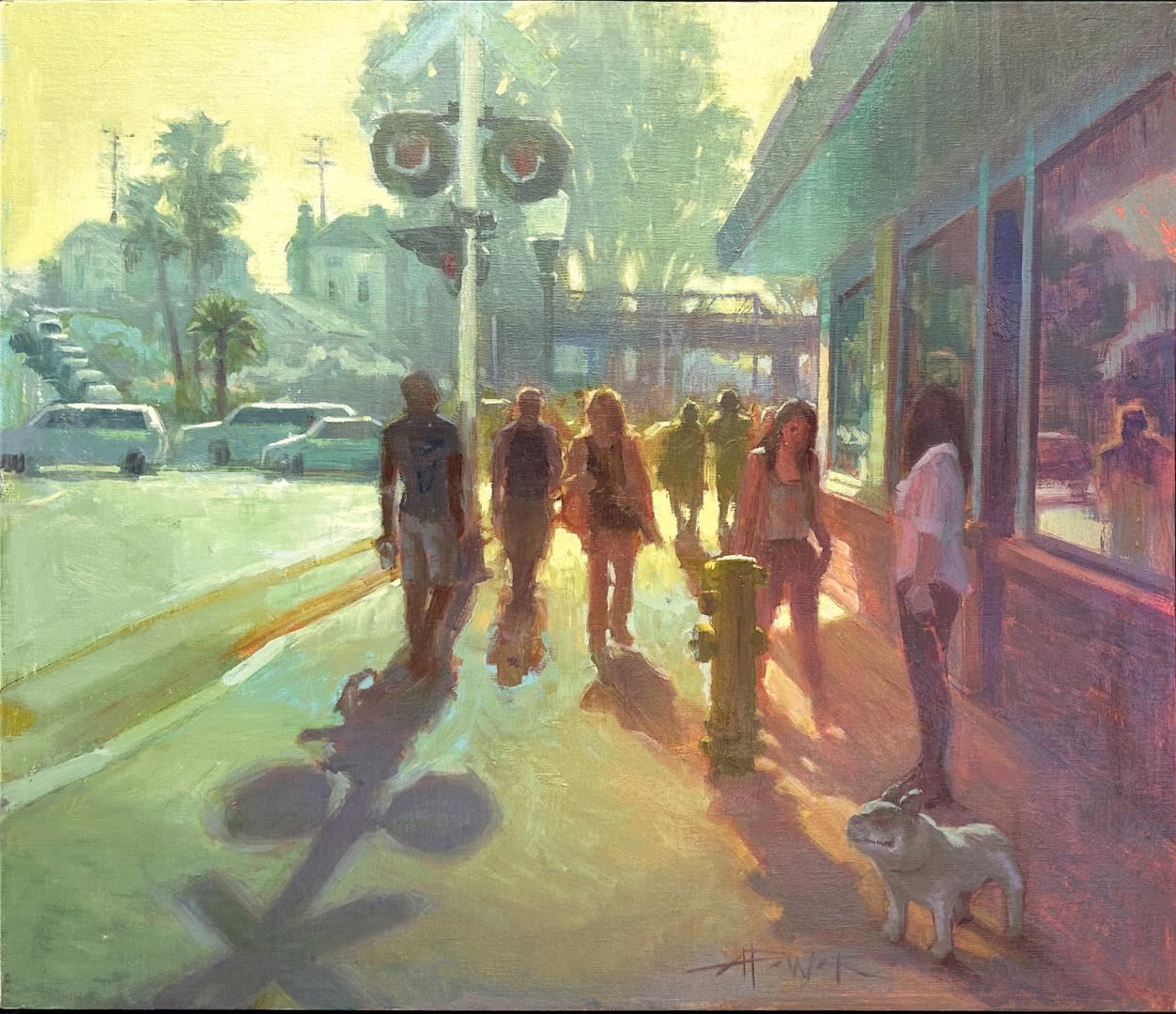 Exhibited at the Hilbert Museum of Art, this 16x20 oil on canvas panel by Anette Power depicts sunlit figures strolling through Santa Cruz, their presence casting lively contrasts amid the shadows, with artist's COA