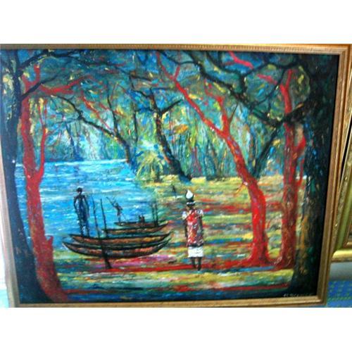 Is a Village scene in East Africa made by Massamba,painted with a knife.