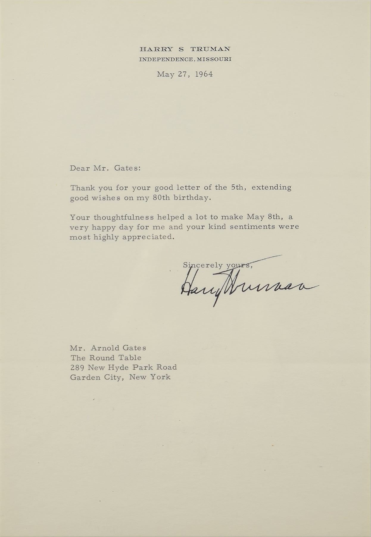 TLS signed "Harry S. Truman," one page, personal letterhead, May 27, 1964. To Arnold Gates, in part: "Thank you for your good letter of the 5th, extending good wishes on my 80th birthday."