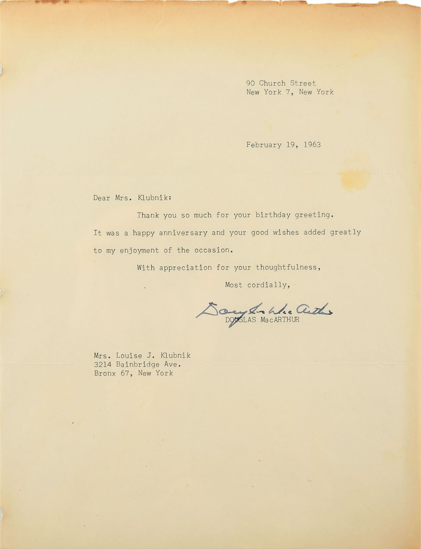 TLS signed "Douglas MacArthur," one page, February 19, 1963. To Louise J. Klubnik, in part: "Thank you so much for your birthday greeting. It was a happy anniversary and your good wishes added greatly to my enjoyment of the occasion." Accompanied by the original mailing envelope.