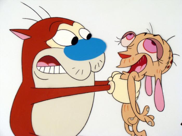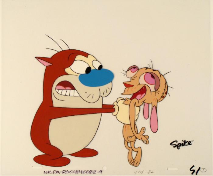 This is an original production animation cel from the Nickelodeon TV show Ren & Stimpy. The show follows two characters - Ren, a crazy Chihuahua - and - Stimpy, an incredibly stupid cat - as they think up to all kinds of hair brained schemes and get themselves into some sticky situations. The Ren and Stimpy Show debuted in August 1991 with a two-part episode, 'Stimpy's Big Day / The Big Shot' and became an instant hit. It was the third Nicktoon ever to be aired on the Network alongside Doug and Rugrats. Wake up Ren... WAKE UP!!!Original Production Art Cel Overall Size of the Cel: 10 1/2" x 1/2" Excellent condition This is an original hand-painted cel set-up used in the production of an episode of "The Ren & Stimpy Show." Each one-of-a-kind set-up represents a slight change in position of the characters. When individually photographed and projected in rapid succession, the images appear to move.