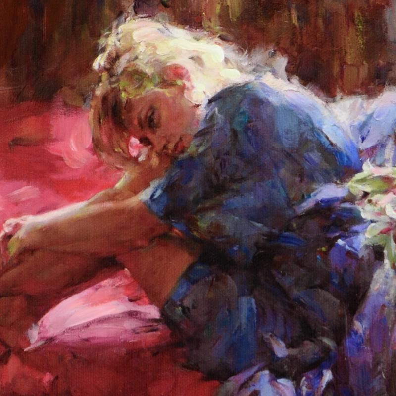 "Waking Up to Flowers" is a limited edition hand embellished giclee on canvas by the husband and wife team, Mikhail and Inessa Garmash! This piece is numbered and hand signed by the artists! Includes Certificate of Authenticity! Measures approx. 12" x 8" (image).