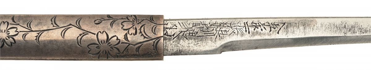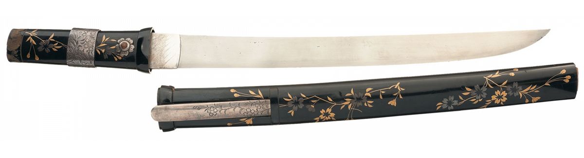 Measuring 18 1/4 inches overall, with a gently waving, well defined temper line on the 13 inch blade, and a nickel habaki with diagonal scoring. The tsuka and saya are both finished in a deep black lacquer with decorative floral inlay, showing golden stems and gold and silver blooms, with the tsuka fitted with raised chrysanthemum pattern mekugi-ana and a 7/8 inch wide floral engraved silver band around the center, and the saya has a pair of pockets, one on either side. The left holds a silver hilted kogatana knife, 7 3/4 inches overall with a 3 7/8 inch blade, engraved with floral designs on the grip and a signature on the blade, and the right pocket contains a pair of silver chopsticks 5 1/2 inches long with floral engraving.