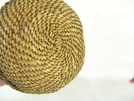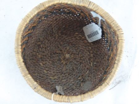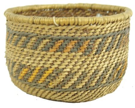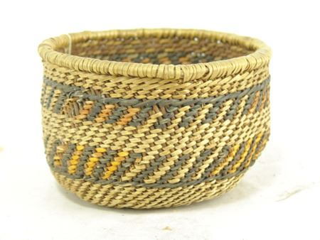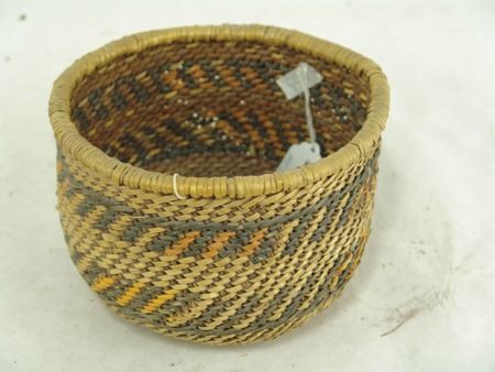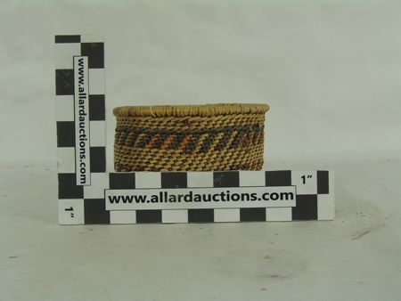 Mid 1900s, Rare four-color polychrome bowl done in traditional twined method with two design bands and fully wrapped rim. Good condition, very minor stitch loss. 4" x 6-1/2"