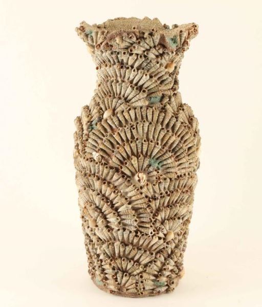 Pottery with shells pressed into surface with sandy interior. Seligman, AZ 1985. Measures 9"x4 1/2".