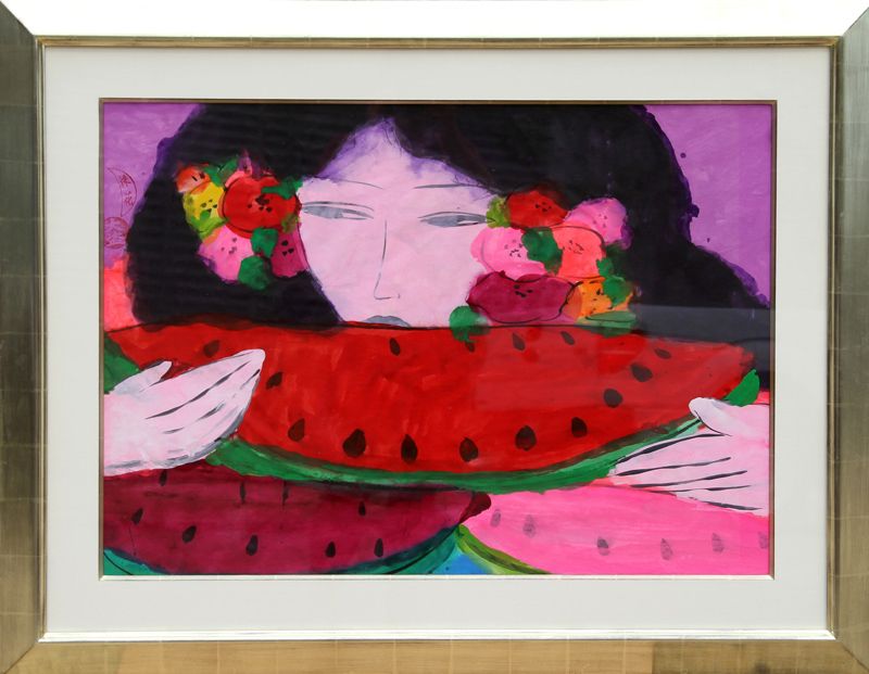 Walasse Ting, Woman Eating Watermelon, Watercolor Painting