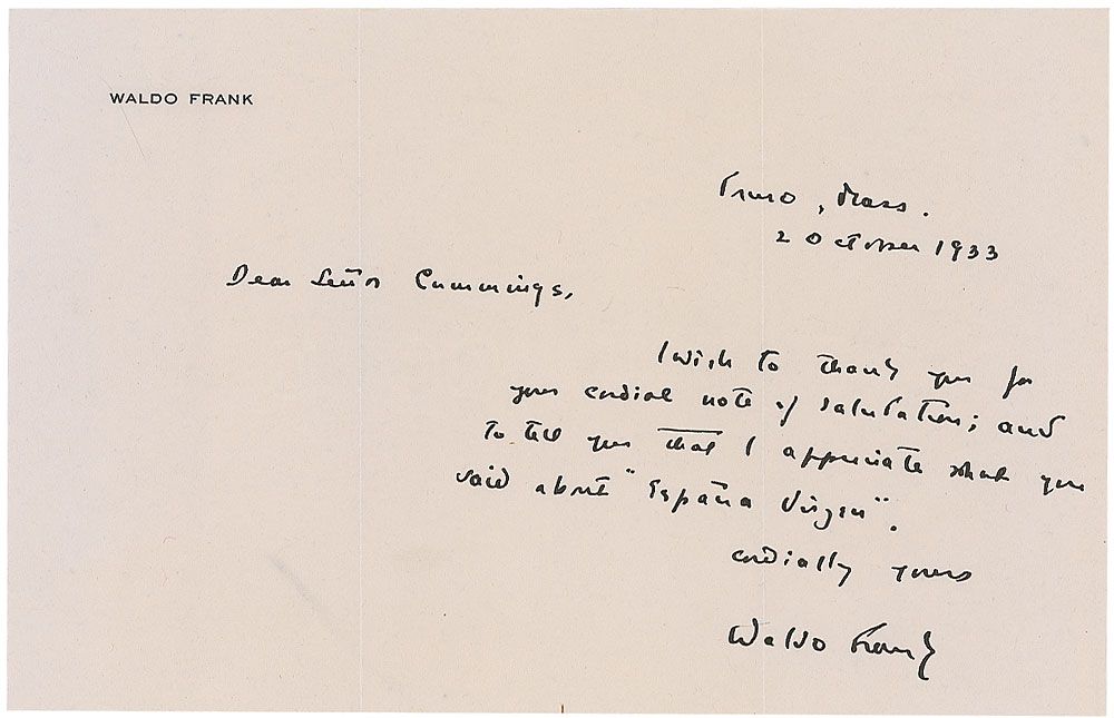 Prolific novelist and critic (1889–1967) known for his studies of Spanish and Latin American literature. ALS, one page, 8.25 x 5.5, personal letterhead, Truro, Massachusetts, October 2, 1933. Response to an admirer. In part: “I appreciate what you said about ‘Espana Virgen.’” In fine condition, with one vertical mailing fold passing through a single letter of the signature. Accompanied by the original mailing envelope, addressed in Frank’s hand.
