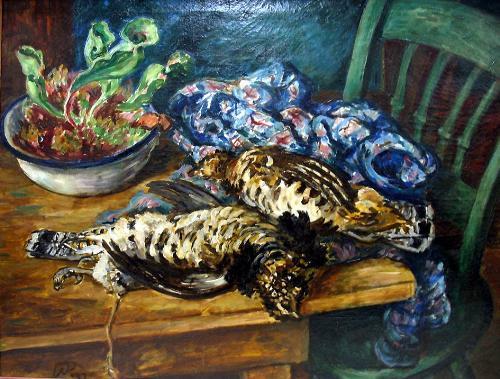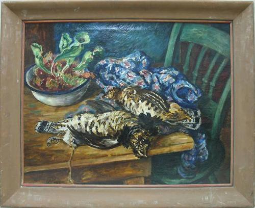 Waldo Peirce oil on canvas of tabletop still life of dead game; listed American; early 20th C.; signed (L.L.) with initials W.P.; framed; image measures 28" x 36" (four patches on reverse)