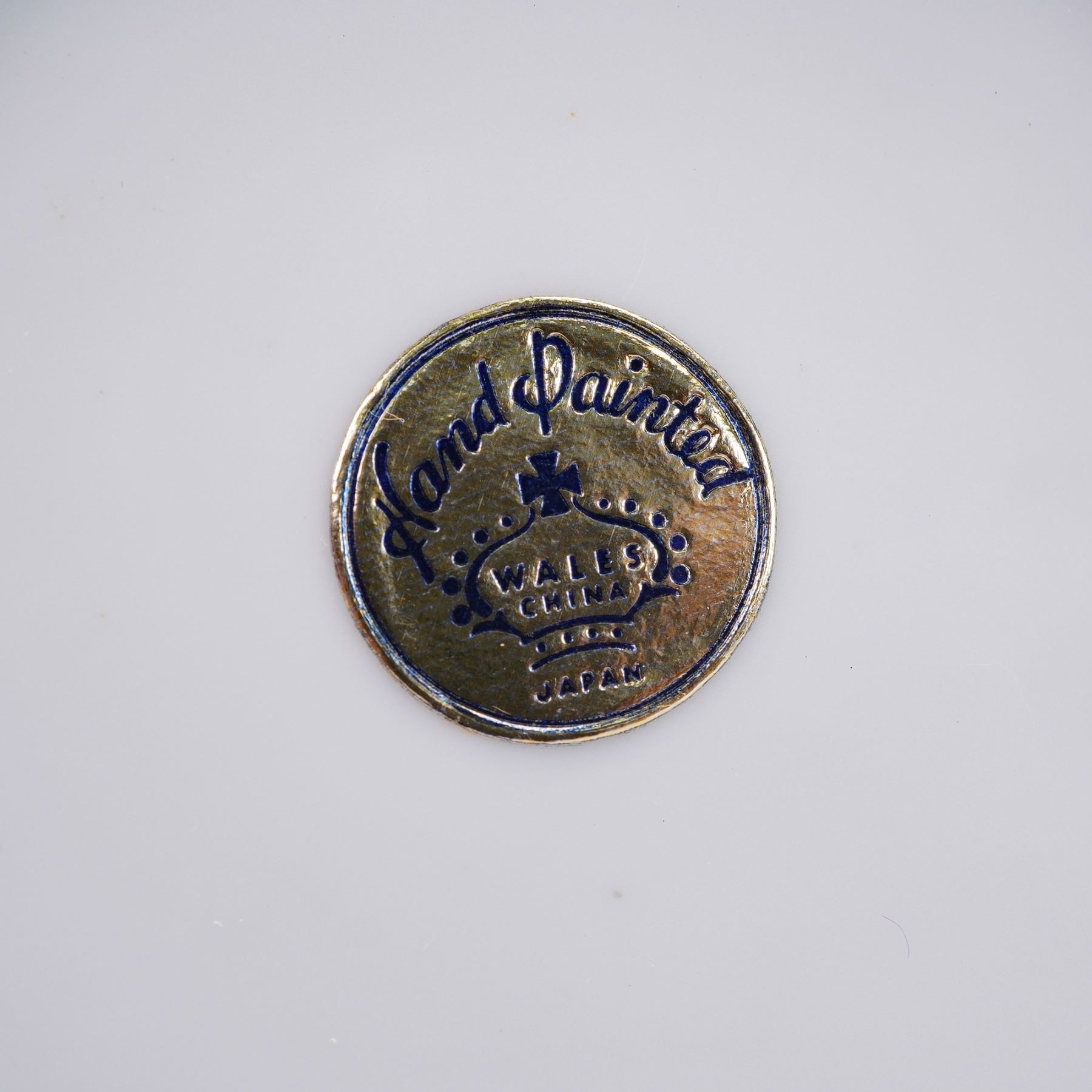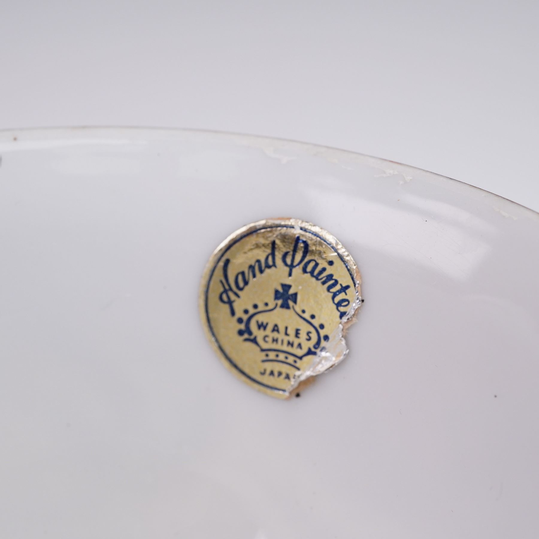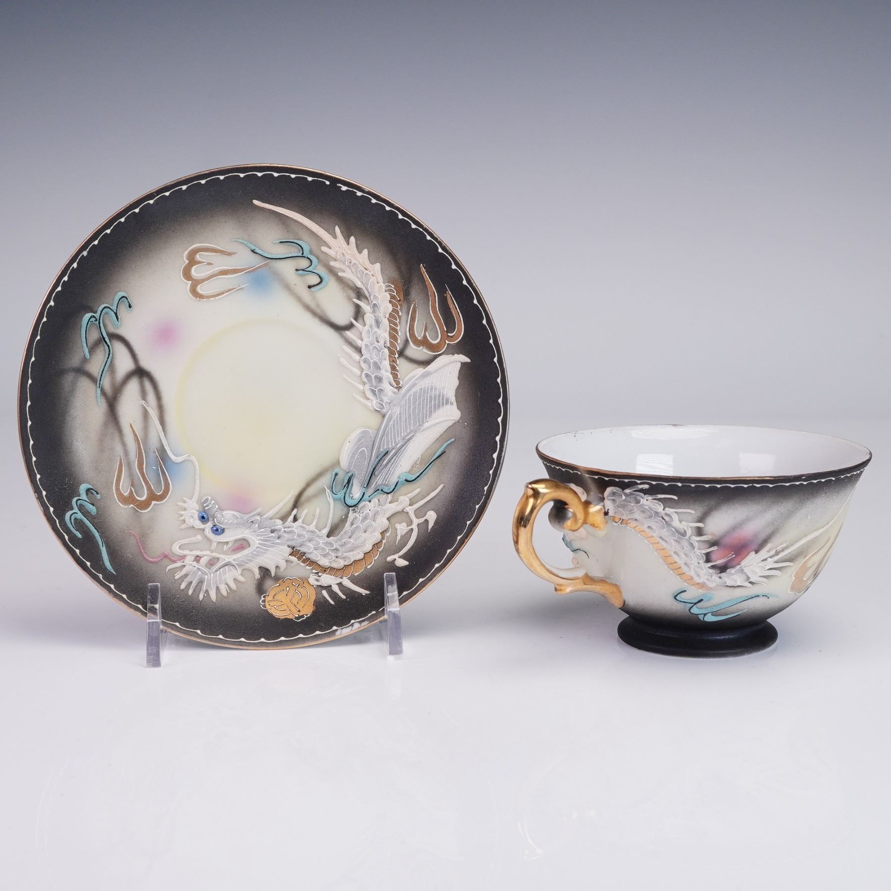 A dramatic hand-painted cup and saucer set by Wales China, Japan, decorated in raised enamel with a boldly rendered white dragon coiled around a smoky, iridescent background. The dragon's finely detailed scales, whiskers, and blue eyes are highlighted in relief against a background of misty grays, bronzes, and sunset hues. Accented with gilt on the ornate handle and cup rim. Retains original foil sticker on the saucer reading - Hand Painted, Wales China, Japan. A striking example of mid-century Japanese export porcelain.