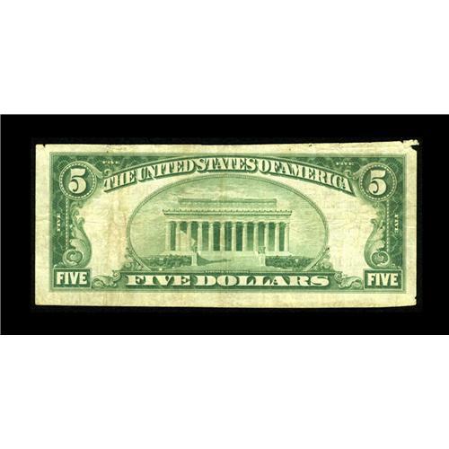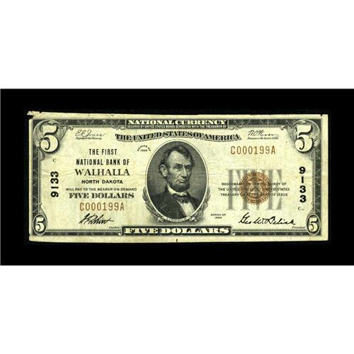 <B>Walhalla, ND</B></I> - $5 1929 Ty. 1 <B>The First NB</B></I> Ch. # 9133<BR>This was the only issuer in this remote Pembina County hamlet. The only other examples of the $5 Type 1 known from here prior to the discovery of this single item are contained on two uncut sheets. <B>Very Fine.</B></I><BR><BR><b>Shipping:</b> Coin/Currency (<a target="_blank" href="http://www.heritageauctions.com/common/shipping.php">view shipping information</a>)