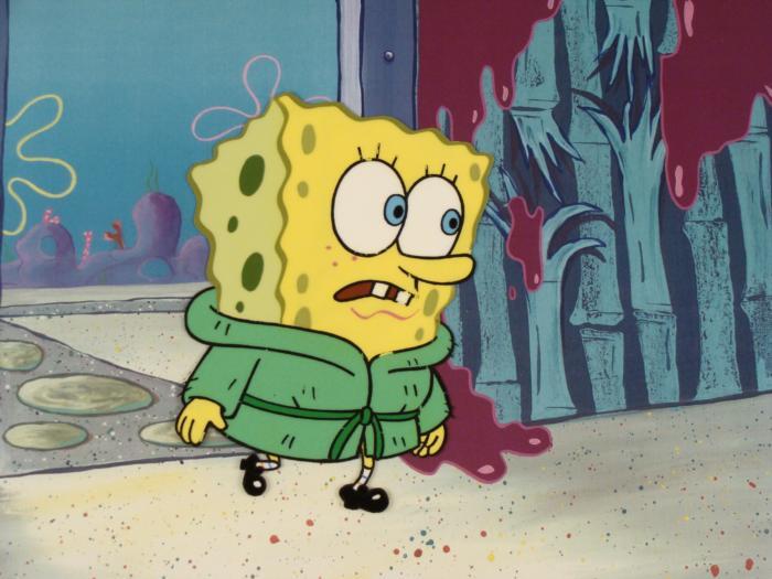 This animation cel and reproduction background are from the Nickelodeon TV show SpongeBob Squarepants. The story takes place under the deep blue sea in Bikini Bottom, where SpongeBob resides. SpongeBob, who is a yellow, porous sponge, is your typical happy-go-lucky character, as he is always cheerful and enjoys making people laugh. Patrick Star, SpongeBob's neighbor who is a starfish, is your average children's show idiot, as he boasts knowing nothing and is often getting himself into ridiculous situations. Between the homes of these two lies the home of the miserable Squidward, a squid, who is known for being grouchy and playing tricks on SpongeBob and Patrick. Both SpongeBob and Squidward work at the Krusty Krab, a fast food business run by the greedy money-loving Mr. Krabs, a crab, the arch rival of the evil, possibly misunderstood, Plankton. Another neighbor, Sandy Cheeks, an athletic squirrel who normally wears an astronaut's space suit, was introduced in "Tea at the Treedome." She spends most of her time inventing and experimenting. SpongeBob is walking into his house.Original Printed Background and Animated Cel Overall Size of Background: 11" x 17" Overall Size of the Cel: 10 1/2" x 12 1/2" Very good condition This is an original hand-painted cel set-up used in the production of an episode of "SpongeBob SquarePants." Each one-of-a-kind set-up represents a slight change in position of the characters. When individually photographed and projected in rapid succession, the images appear to move.