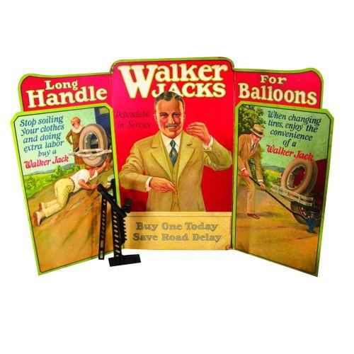 Walker Automotive Jacks Cardboard Tri-fold Die Cut Window Store Display, long handle for balloons. Original sticker on back showing directions. Some staining and edge ware otherwise very good original condition. 90 X 36 inches.