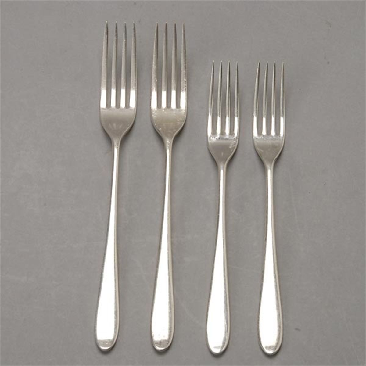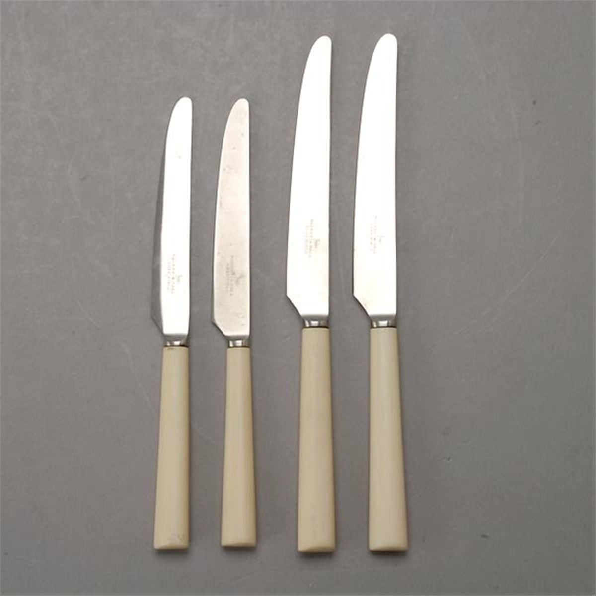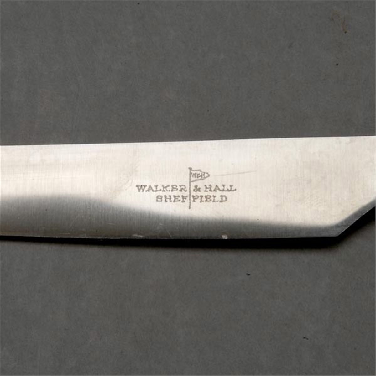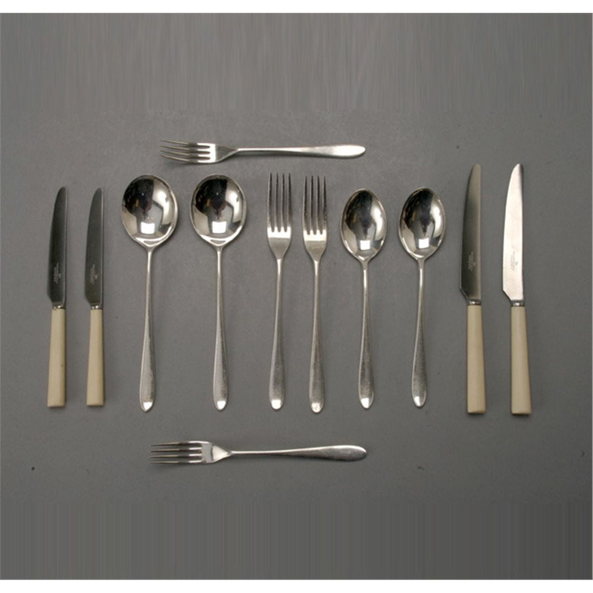 Walker & Hall Silver Plate Service, including bone handled knives: nine knives (length 8 1/2 inches); nine dinner forks (length 8 inches); nine soup spoons; nine tablespoons (length 7 1/4 inches); nine lunch forks; and nine fruit knives (54)