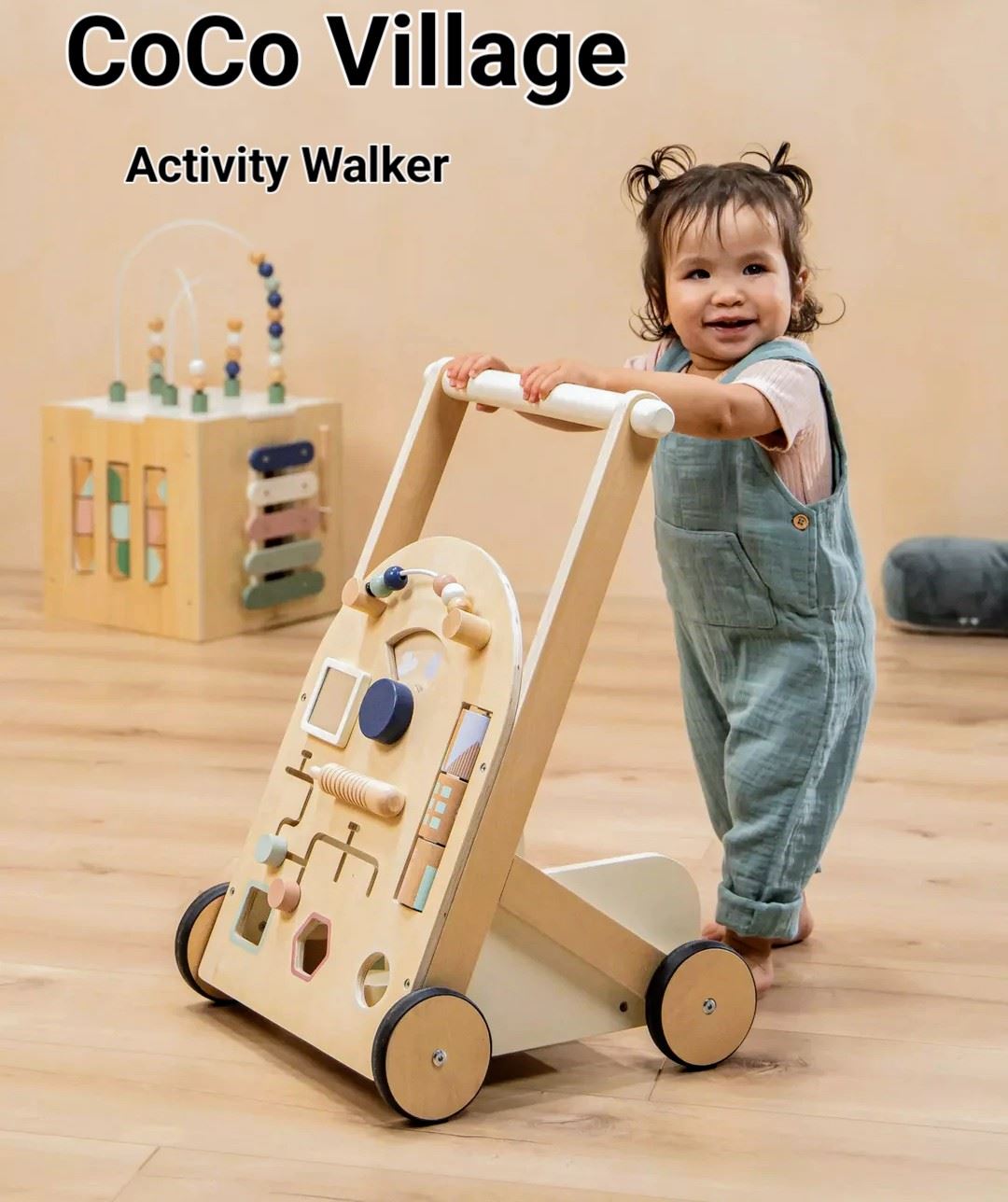 Wooden activity walker for toddlers, enhances motor skills with interactive features, new.