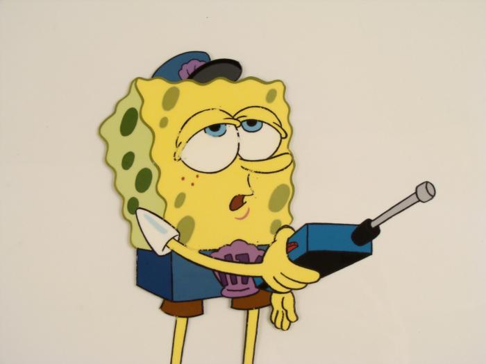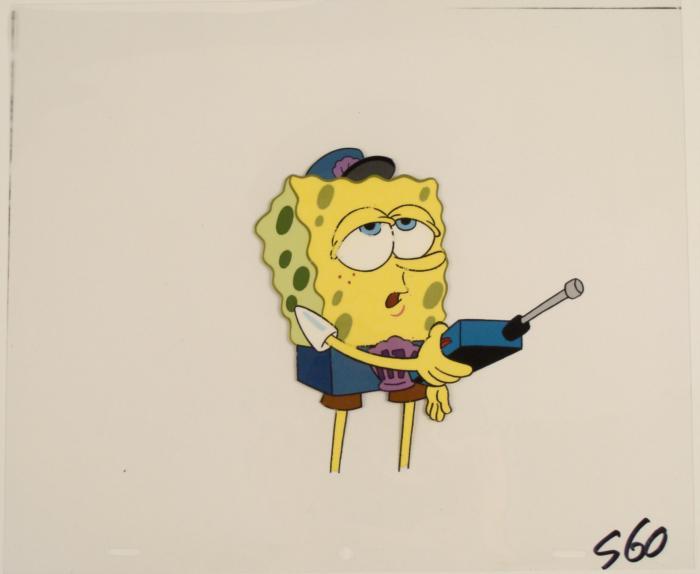 This original animation cel is from the Nickelodeon TV show SpongeBob Squarepants. The story takes place under the deep blue sea in Bikini Bottom, where SpongeBob resides. SpongeBob, who is a yellow, porous sponge, is your typical happy-go-lucky character, as he is always cheerful and enjoys making people laugh. Patrick Star, SpongeBob's neighbor who is a starfish, is your average children's show idiot, as he boasts knowing nothing and is often getting himself into ridiculous situations. Between the homes of these two lies the home of the miserable Squidward, a squid, who is known for being grouchy and playing tricks on SpongeBob and Patrick. Both SpongeBob and Squidward work at the Krusty Krab, a fast food business run by the greedy money-loving Mr. Krabs, a crab, the arch rival of the evil, possibly misunderstood, Plankton. Another neighbor, Sandy Cheeks, an athletic squirrel who normally wears an astronaut's space suit, was introduced in "Tea at the Treedome." She spends most of her time inventing and experimenting. SpongeBob is holding a walkie-talkie.Original Production Animated Cel Overall Size of Cel: 10 1/2" x 12 1/2" Very Good ConditionThis is an original hand-painted cel set-up used in the production of an episode of "SpongeBob SquarePants." Each one-of-a-kind set-up represents a slight change in position of the characters. When individually photographed and projected in rapid succession, the images appear to move.