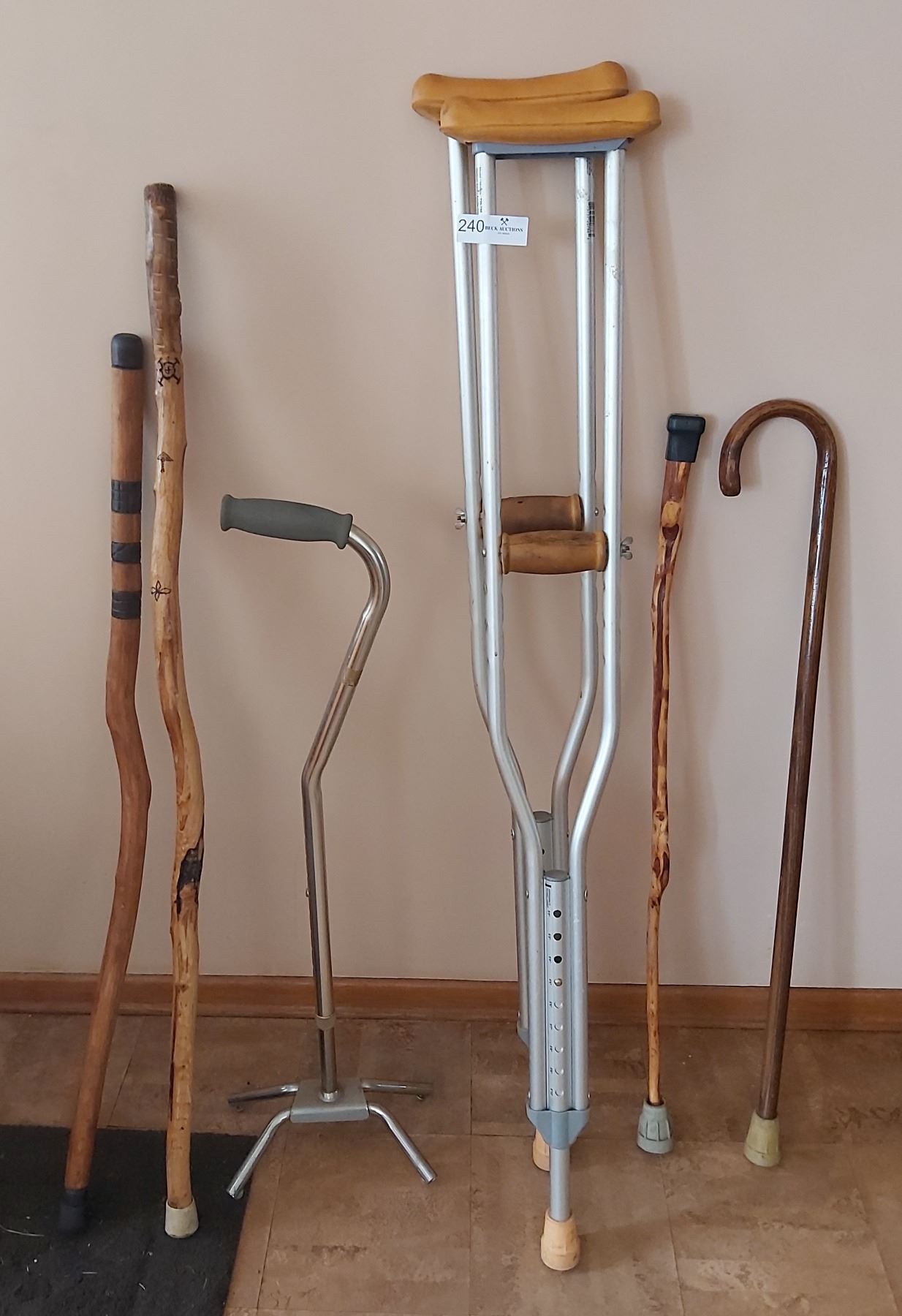 3 walking sticks, 2 canes (one needs rubber feet), and pair of crutches.