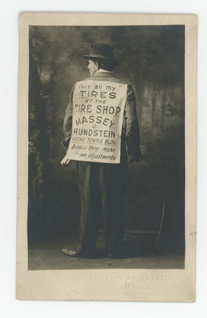 I buy all my tires at the Tire Shop. Massey & Pfundstein. Masonic Temple Building. Foley's Art Studio, Joliet Illinois.