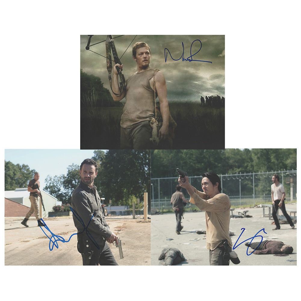 Three color satin-finish 10 x 8 photos of leading actors from the Walking Dead television series, each signed in blue felt tip by the pictured actor: Andrew Lincoln, Norman Reedus, and Steven Yeung. In overall fine condition. Originally obtained by in-person specialist Mike Wehrmann.