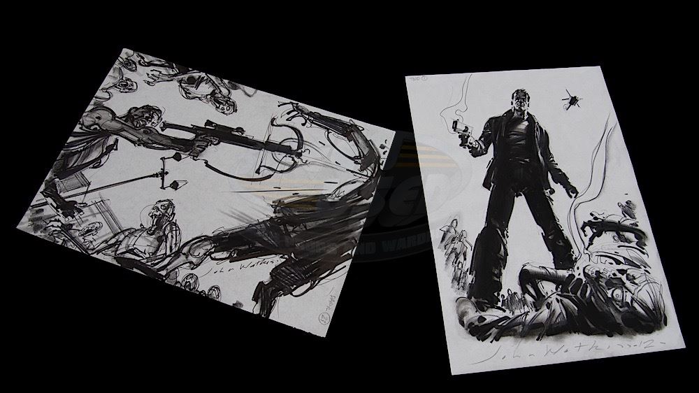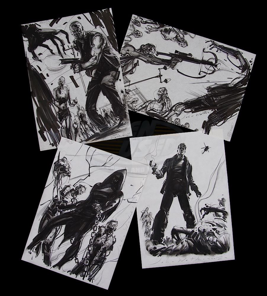 (AMC, 2010) This set of four original principle character design sketches by David Watkiss. The sketches are done in pen and ink on paper, one is marked "Merl 29", another is marked "Daryl 27" and two are marked "TWD 1" & TWD 3". Each piece measures 8.25" x 11.5" and are signed by the artist.